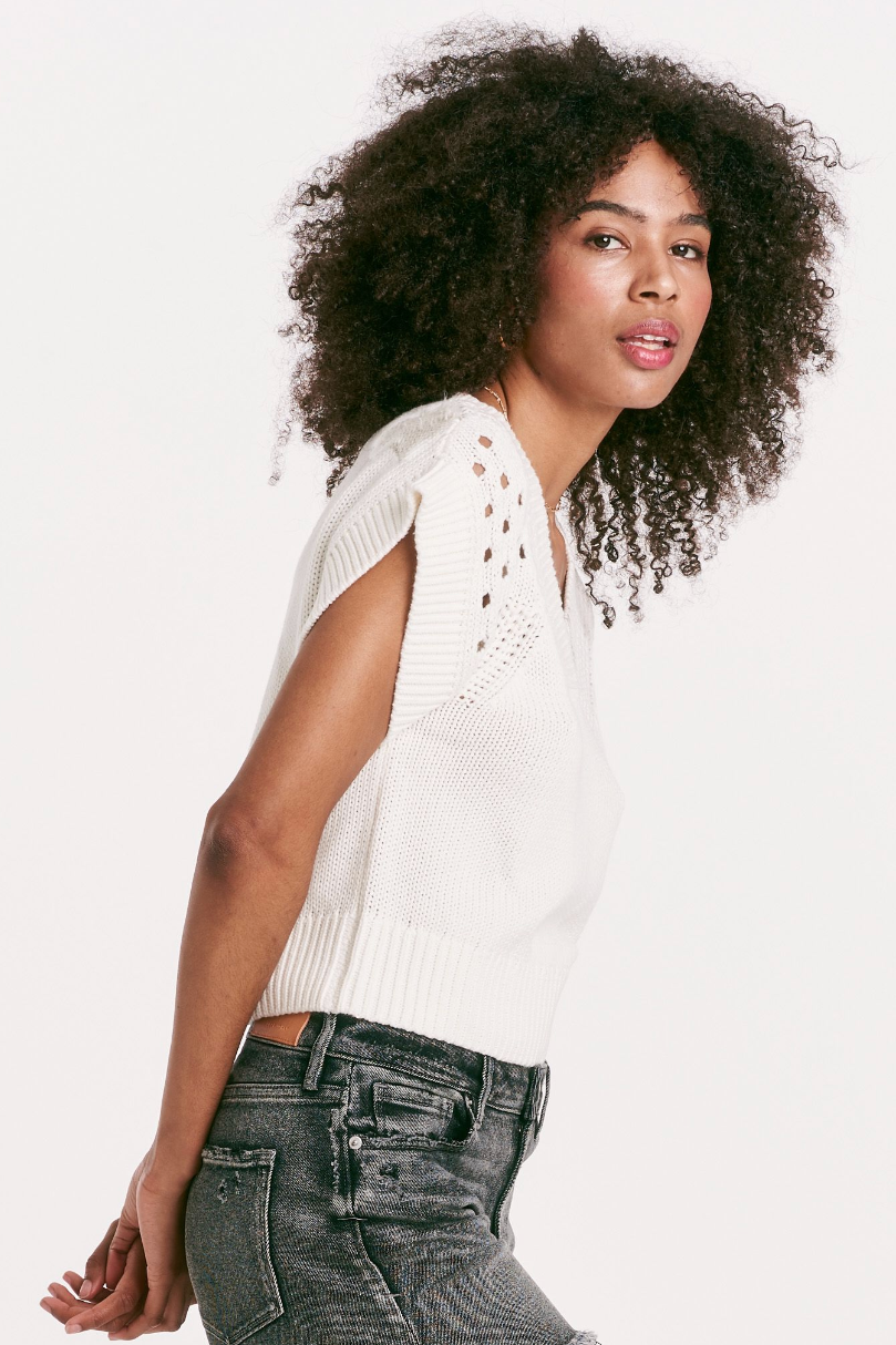 Crochet detail front & back & sides in pointelle weave, drop shoulder v-neck sweater finished with banded cuffs & waist. Solid color yarn on standard fit. Stunning elegance, classic aesthetics for casual settings.