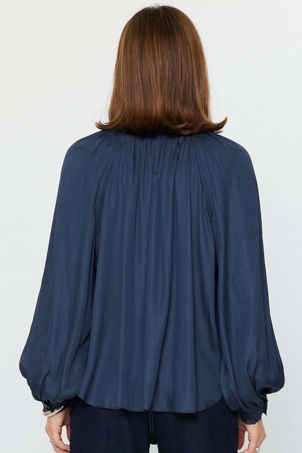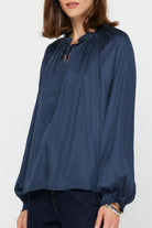 A softly draped peasant blouse with a gathered tie neckline and billowy long sleeves for a relaxed yet polished look. The silky finish and loose silhouette make this blouse easy to wear from desk to dinner. The Current Air peasant blouse features elasticized cuffs and a subtle keyhole tie at the neck for gentle detailing. Pair it with tailored pants or jeans for an understated, modern outfit.