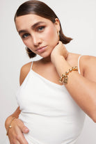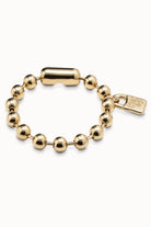 A polished 18k gold‑plated bead bracelet with a signature UNOde50 tag and a smooth cylindrical clasp for a modern finish. The Copito de nieve Bracelet pairs rounded beads on a linked wire for a refined, minimalist silhouette. Wear it alone as a standout accent or layered with other bracelets for a curated look. This piece is crafted by UNOde50 and reflects the brand’s artisanal, contemporary aesthetic. 18k gold-plated. Iconic of UNOde50, 100% handmade in Spain.