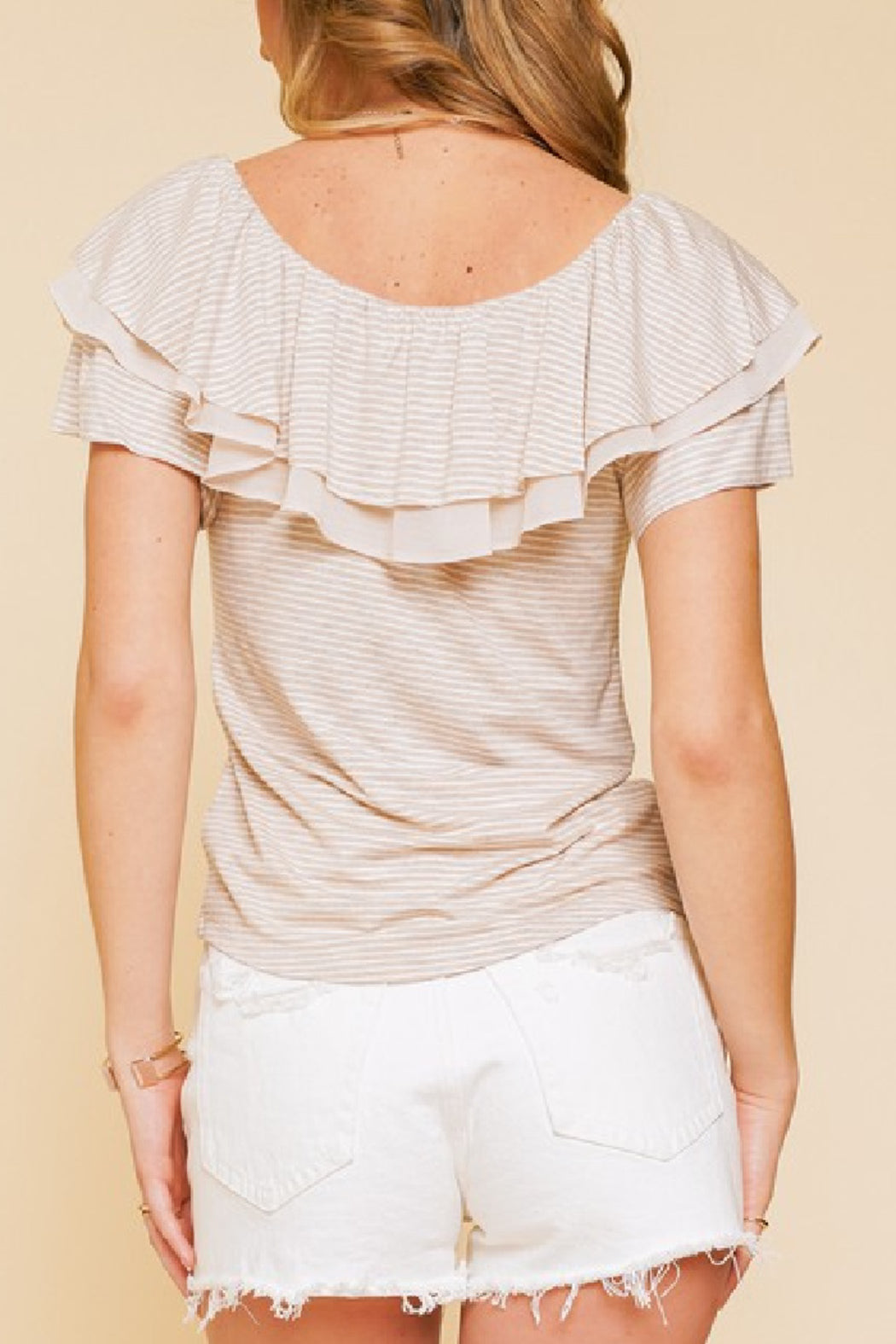 Classic ruffled top with round neckline and contrast detail. Model is wearing a size small. Refer to measurements for your perfect fit. Across chest measurements; Small 16", Medium 17", Large 18". Shoulder to hem (longest point); Small 25", Medium 25.5", Large 26".
