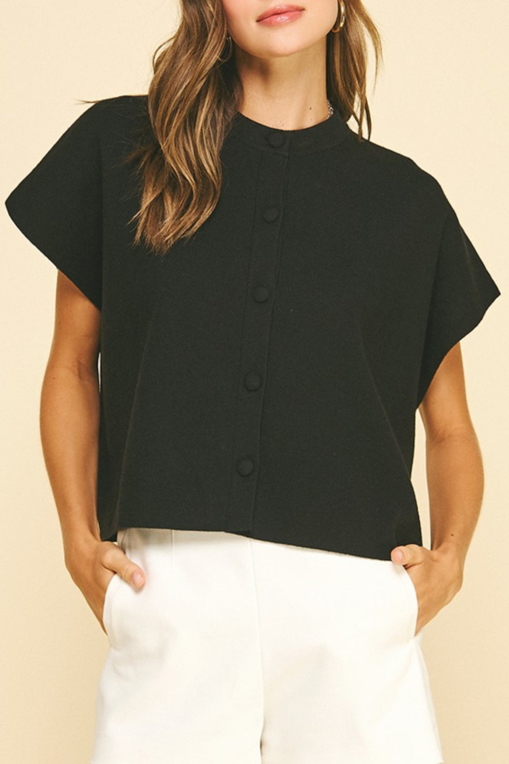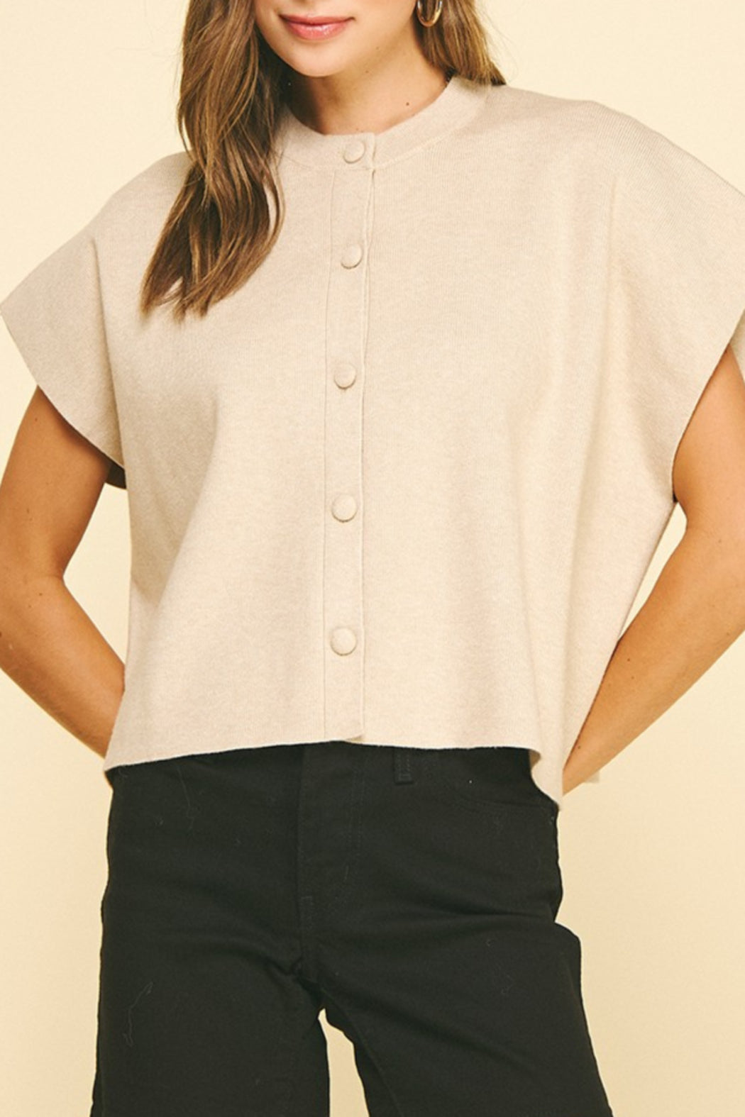 Cap sleeve button down sweater. Layer or wear alone. Model is wearing a size small. See measurements for your perfect fit.