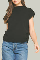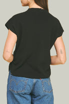 A clean, everyday short-sleeve sweater rendered in black with a slightly raised boat-style neckline. Sporting a relaxed, silhouette with side shirring detail. May be styled simply for easy dressing — perfect for casual weekend wear or dress it up for a polished layered look. The minimal shape makes it a versatile staple for seasonal wardrobes.