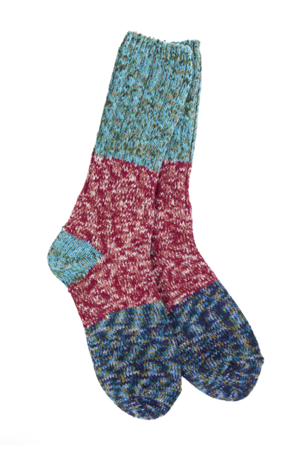 Our #1 best seller, the Weekend Collection Ragg Crew. Light weight, stylish and fun. One Size Fits Most (Women's Shoe Size 6-10). Designed in Tennessee - Made in Korea. Contents: 99% Polyester, 1% Spandex. Washing Instructions: Turn your socks inside out before washing. Wash in cold water. Do not bleach. Tumble dry with low heat. Do not iron.