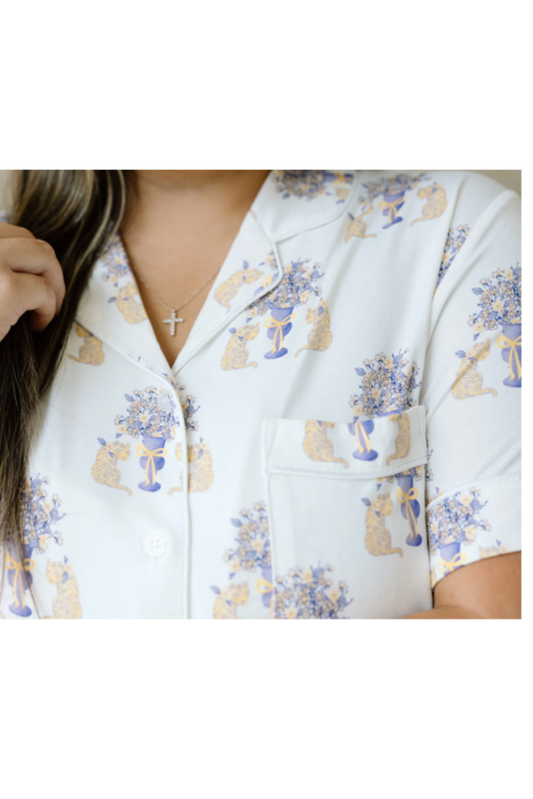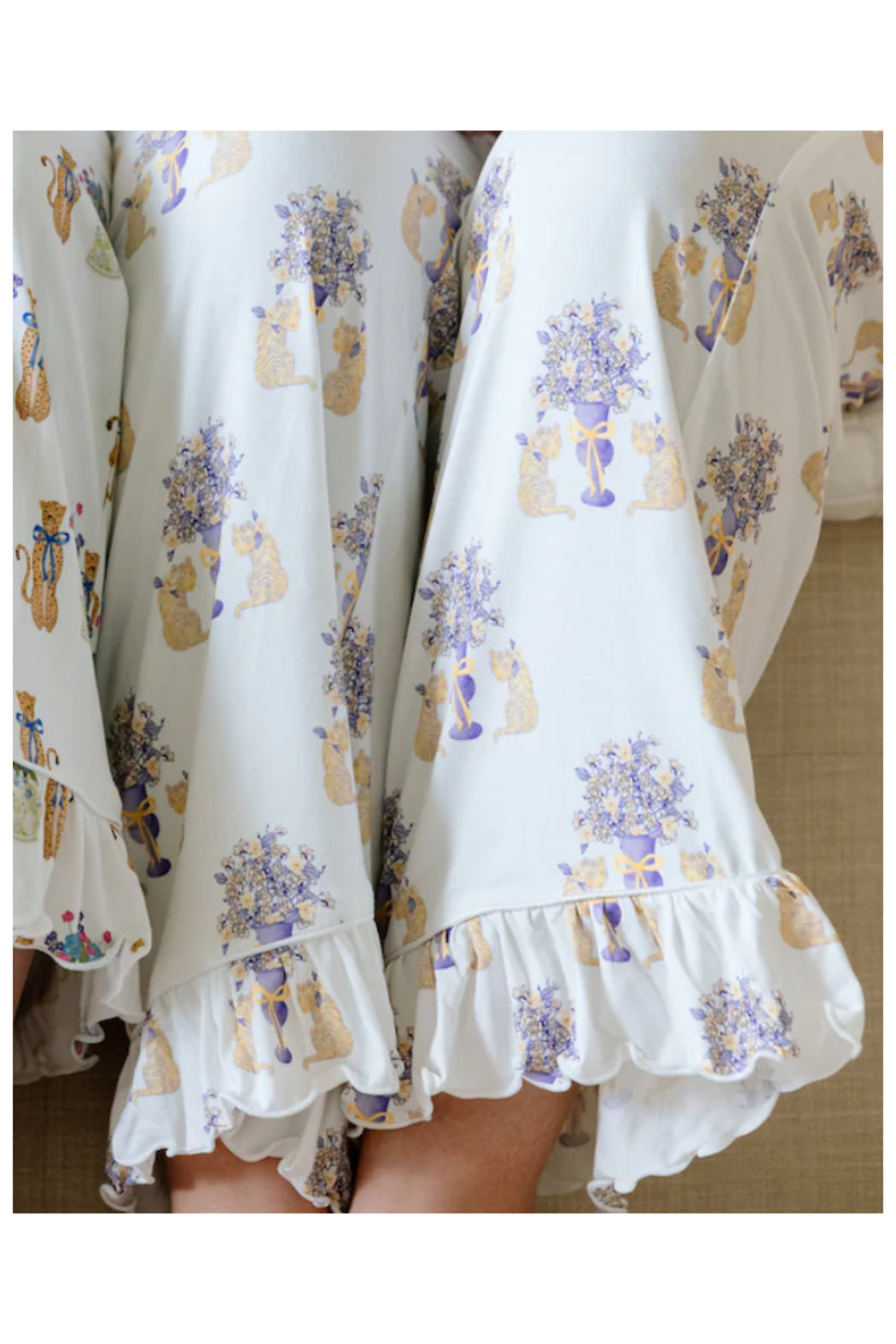 Ideal for game days, watch parties, or winding down after cheering on the Tigers, these pajamas bring the essence of LSU spirit right into your home. Whether you're celebrating a touchdown, relaxing in style, or simply enjoying a quiet evening, these pajamas deliver both comfort and Tiger flair. Embrace the spirit of luxury and warmth, and let your LSU pride shine with every peaceful night's sleep. This set includes pants with an adorable ruffle hem that adds just the right touch of charm to your gameday loungewear.