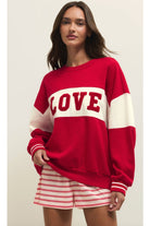A slouchy, oversized sweatshirt with a bold varsity-style "LOVE" across the chest. The Oversized Love Sweatshirt from Z Supply is made from a cozy knit that drapes into a relaxed silhouette and features ribbed cuffs and hem. Its crew neckline and long sleeves make it perfect for casual layering or lounging at home. Pair it with denim or sleep shorts for an easy, lived-in look. CVC Fleece: 60% Cotton 40% Polyester
