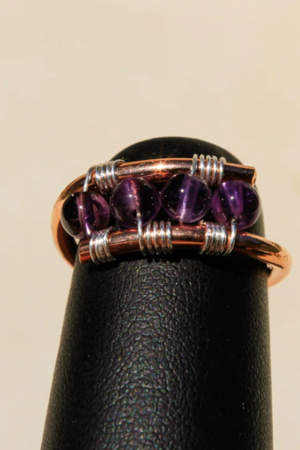 Custom shaped Copper Ring with Amethyst Beads hand crafted high in the mountains of Northern New Mexico. Custom made Copper ring with Sterling Silver wire and 4mm Amethyst/Moonstone/Turquoise/Amazonite Beads. It is hand formed, hand textured and metalsmith all the materials for a truly unique piece of art! Each piece is hand made - Item shipped may vary slighty from item shown in pictures.
