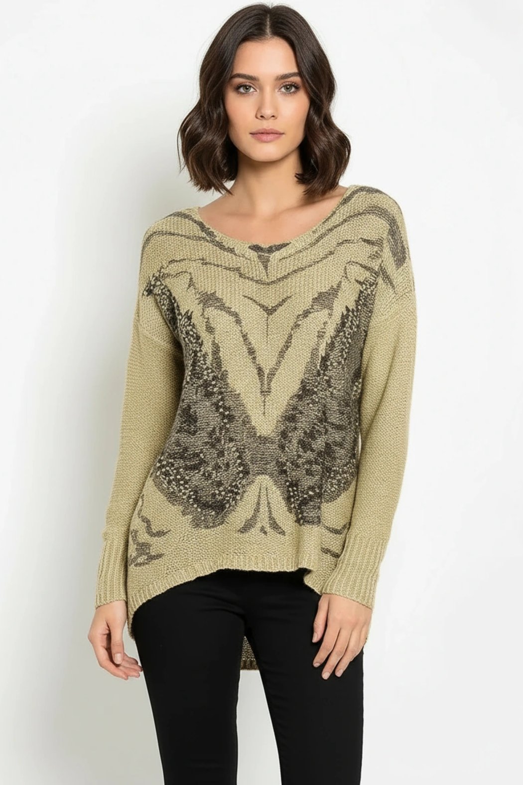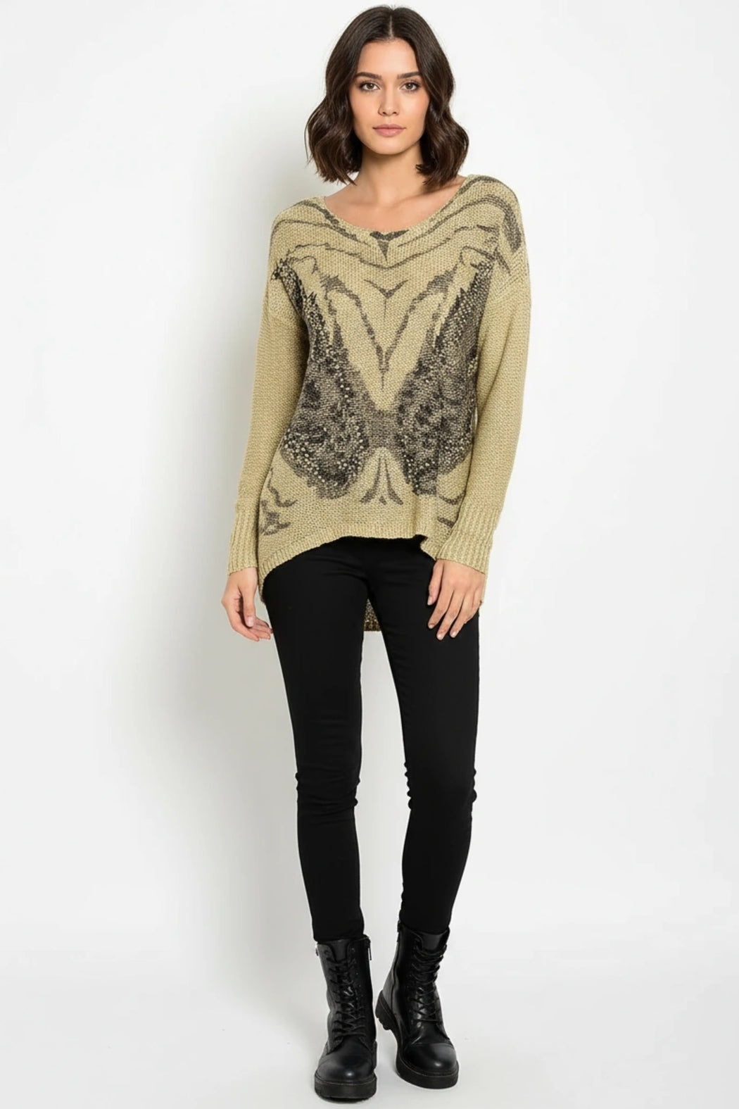 Mix cold season with prints and studs and you will get a beautiful sweater! This stunning piece features a big butterfly printed on front with gorgeous detailed silver studs over the wings, long sleeves, scoop neckline and oversized asymmetrical style for your day out comfort. Wear it with black jeans or leggings, a jacket and combat boots for you Fall weekend style. Model wears size S/M FL: 24" BL: 29" B: 25"