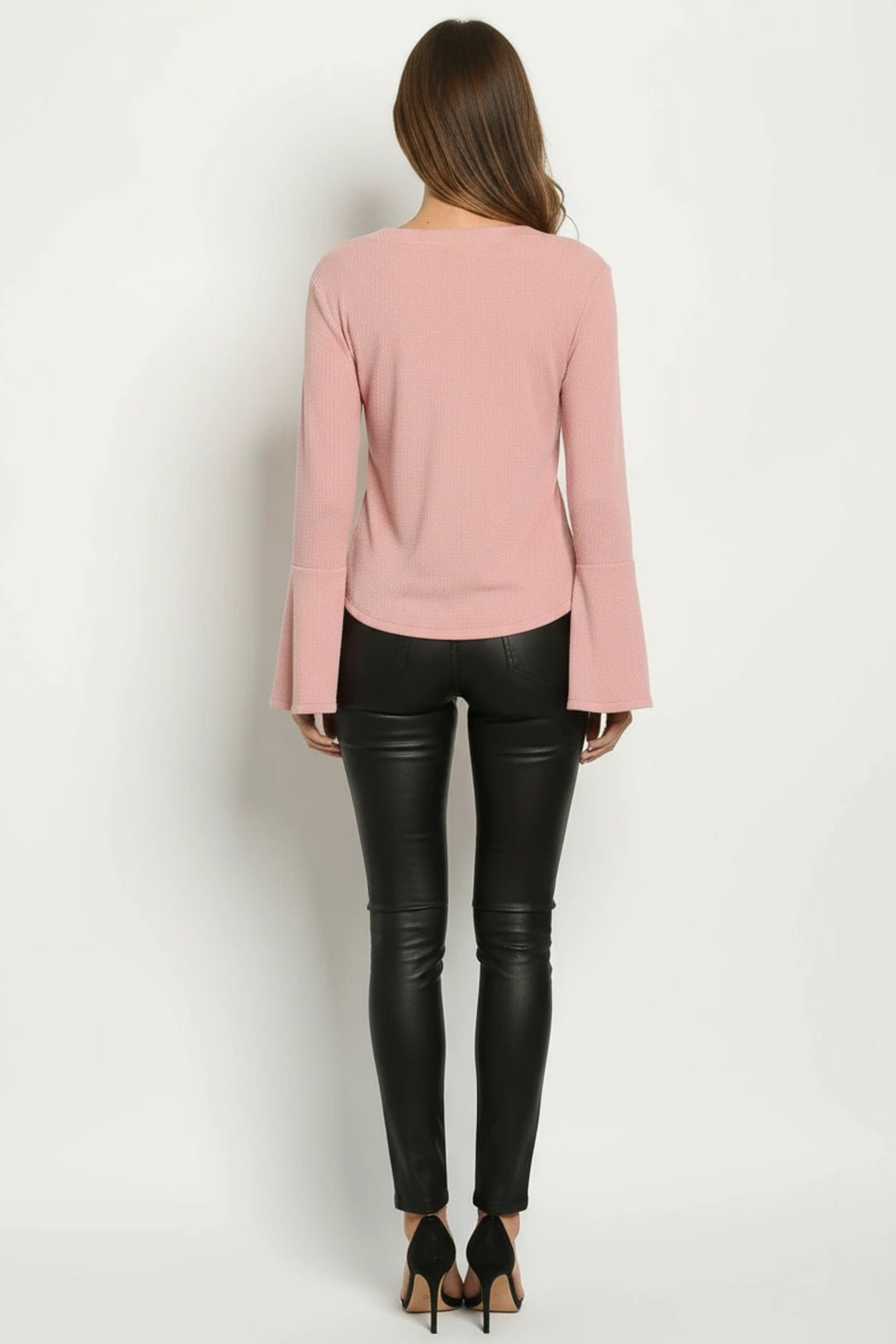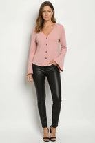 Elevate your wardrobe with this Buttons Bell Sleeves Cardigan, designed for both style and versatility. It features a soft, lightweight fabric, making it a comfortable choice for layering throughout the seasons. The cardigan is highlighted by a beautiful dust pink color with front button details, a V-neckline, and long, elegant bell sleeves that add a touch of sophistication to any outfit. Perfect for semi-casual or office outfits, pair it with skirts or with your favorite pants, or wear it fully unbuttoned over your dresses. This wardrobe essential provides both functionality and timeless design for effortless styling, unlined, material has stretch. Model is 5'7" and wears size Small L: 23" B: 34" W: 34"