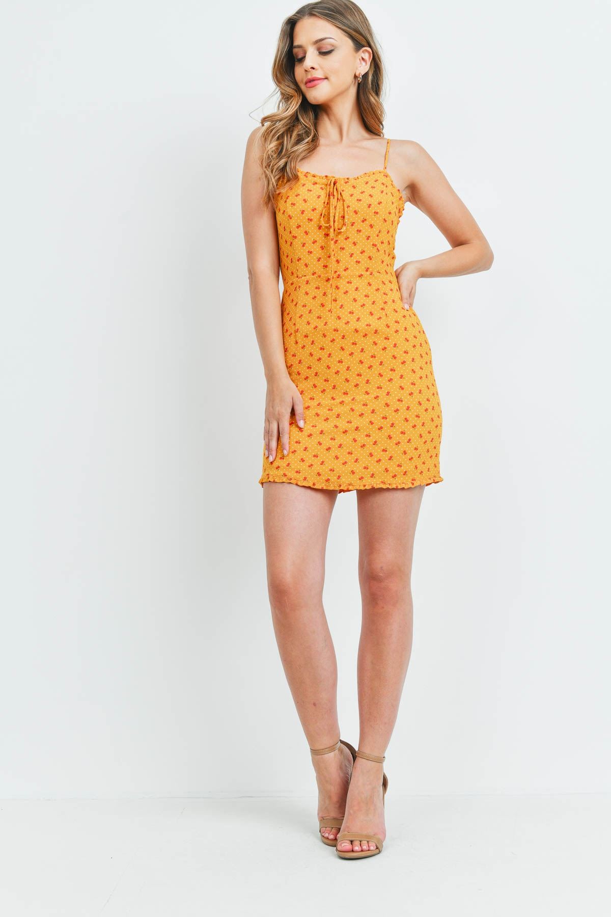 Bring the fun vibes to your summer wardrobe with our pencil mini dress! It features mini cherry prints all over the mustard solid color, front center self tie detail with a beautiful sweetheart neckline nicely adorned with thin ruffle trim detail all along the top line and the bottom hemline, a fitted bodice style, adjustable shoulder spaghetti straps for easy wear and back hidden zipper closure, fully lined, material has little stretch. Wear it with a pair of white fashion sneakers for your Summer vacation trip. Model wears size Small L: 32" B: 32" W: 26" H: 36"