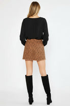 The perfect piece to complete any animal lover wardrobe! This denim skirt features leopard prints all over, button front closure detail, two front sides large envelope pockets, fitted waist band with belt loops and relaxed on skirt part, straight bottom hemline with raw edges detail and a mid thigh length, material has little stretch, unlined. Wear it with almost anything for different looks, from casual to a night out style! Model wears size Small L: 14.5" W: 30" H: 37"