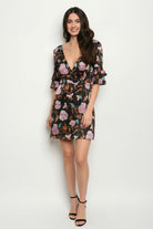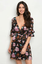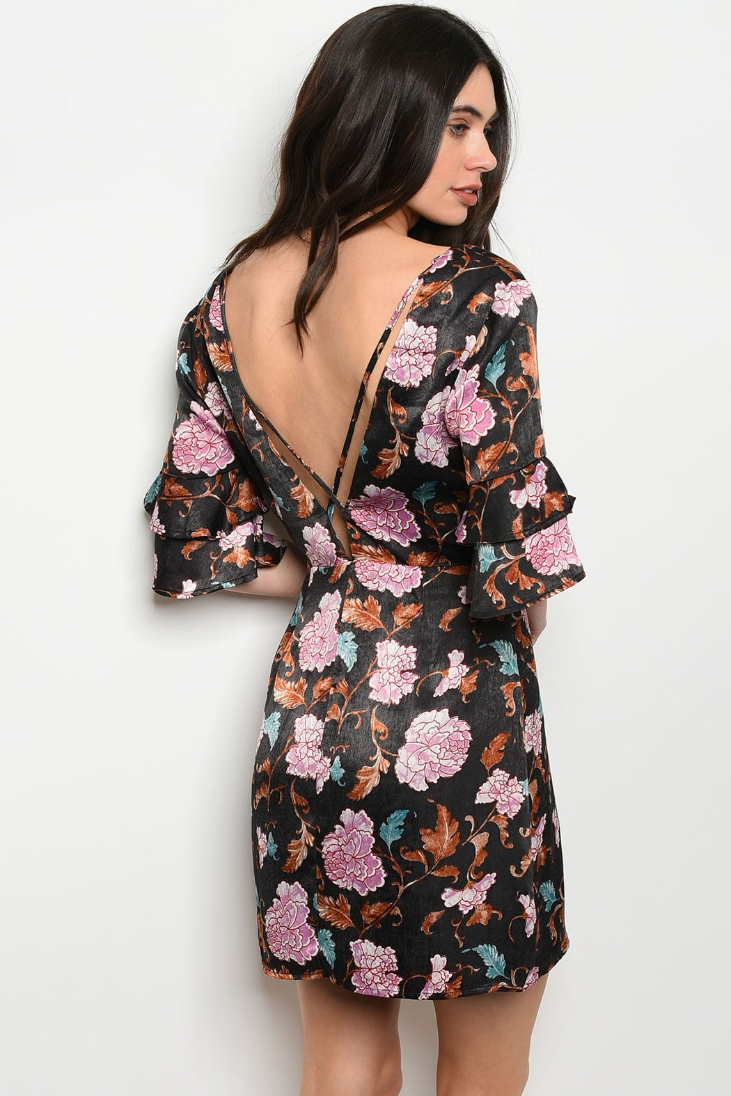 Silk, ruffles and florals! Is there anything else you could want for a perfect cocktail dress this season? This stunning dress features beautiful Autumn floral prints all over, ruffle short sleeves, surplice front V-neckline, nice strap detail along the low V-backline, mini length, hidden side zipper closure, fully lined, material has little stretch. Wear it with high heels and accessorize it with jewelry for your party event. Model wears size Small L: 32" B: 42" W: 26" H: 38"