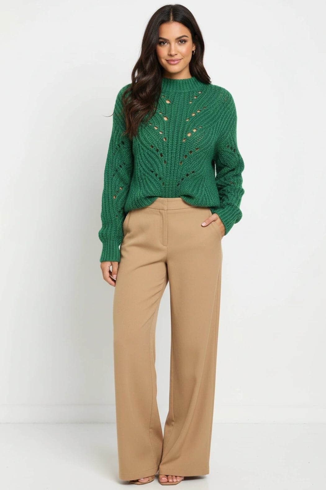 Stay warm and stylish with this Chunky Knit Sweater, designed to offer both comfort and versatility for your wardrobe. Featuring a cozy mock neckline and a chunky knit texture, this sweater provides a snug fit while maintaining a relaxed silhouette, a knitted pattern with a semi seen through front detail, mid hips length and dropped shoulders. The long sleeves and ribbed hem detail enhance its classic appeal, making it an easy pairing with jeans, pants, long skirt or any casual outing. Crafted from a soft, breathable material, it ensures warmth without compromising on comfort. Ideal for layering in colder months, this sweater is a timeless addition to your seasonal collection. Model wears size Small L: 23" B: 44" W: 42"