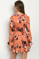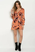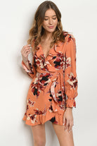 The Ruffles Peach Floral Wrap Dress combines timeless elegance with a fresh, feminine touch. Featuring a delicate floral design, this dress showcases a charming peach color that complements a variety of skin tones. The wrap style offers a flattering fit for all body shapes with a self tie closure on side, front V-neckline with the ruffle detailing all the way to the bottom hemline adding a playful yet sophisticated element, long sleeves with cinch cuffs, mid thigh length, material has some stretch, unlined. Perfect for cocktail events, brunch dates, or night outings, this dress ensures both comfort and style. Elevate your wardrobe with this versatile and graceful piece today. Wear it at your cocktail event with high heels ankle boots and a warm coat for the cooler nights. Model wears size Small L: 32" B: 32" W: 26"