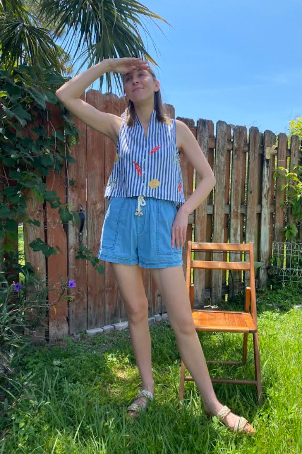 Stripes and shells! Beach comb in this iconic embroidered top from Shore! with a breathable cotton body and trendy collarless V neck, mix and match the Alva tank with the whole wardrobe