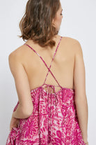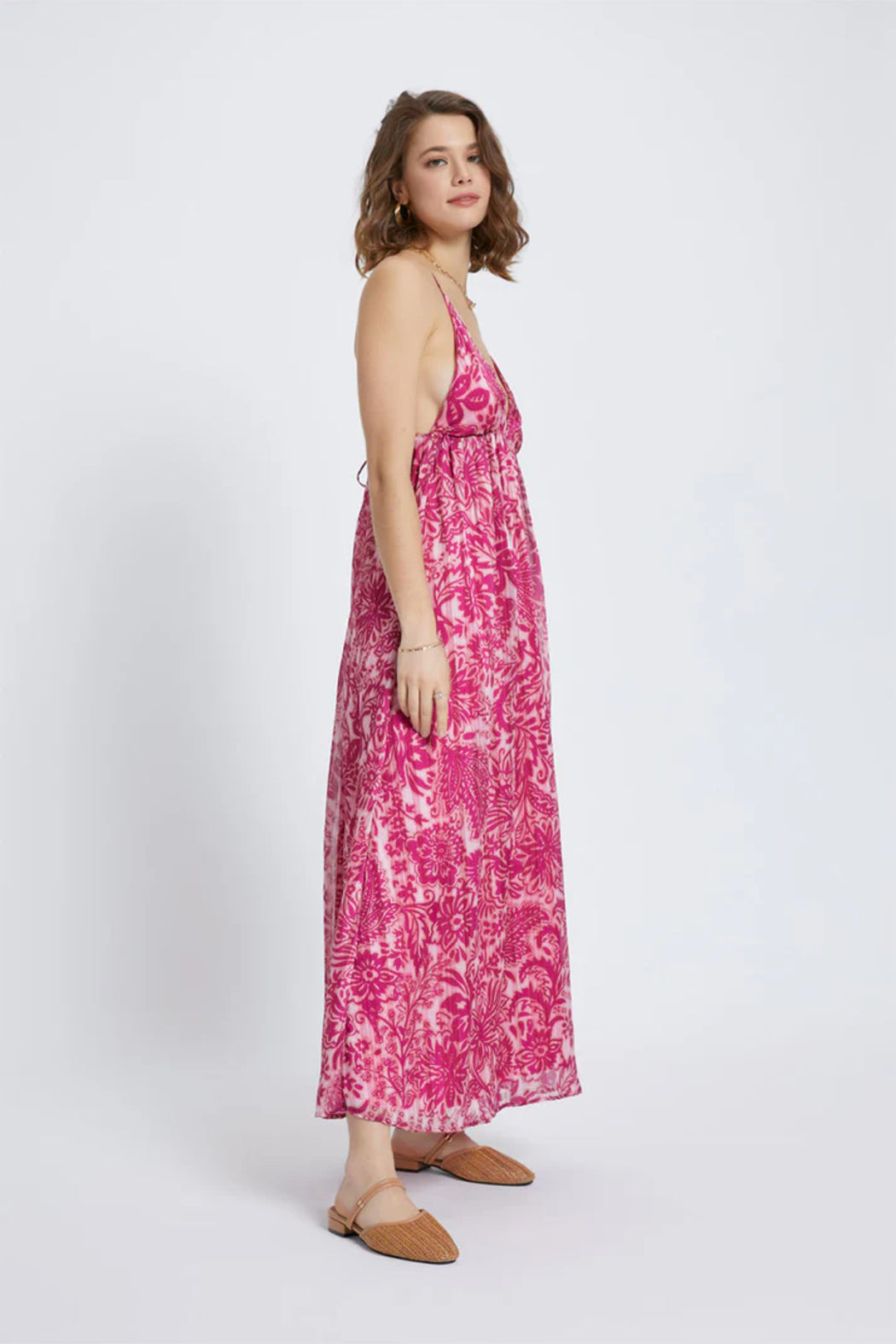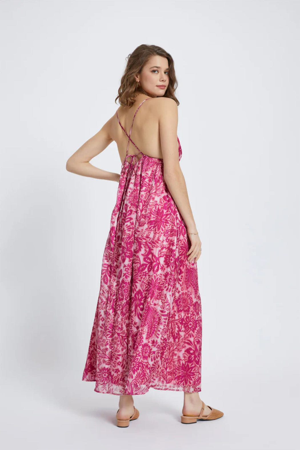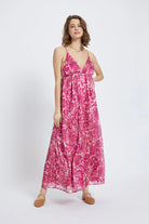 Slip into the radiant elegance of the Magenta Gold Azure Maxi Dress. A breezy, show-stopping silhouette designed to turn heads under the sun or moonlight. This resort-ready style features a plunging V-neckline and adjustable spaghetti straps, offering both comfort and allure. Crafted from lightweight rayon, the airy tiered skirt flows effortlessly with every step, evoking the easy beauty of a Santorini escape. Perfect for beachfront dinners, summer soirées, or a dreamy getaway wardrobe refresh, this dress is your new go-to for feminine sophistication.
