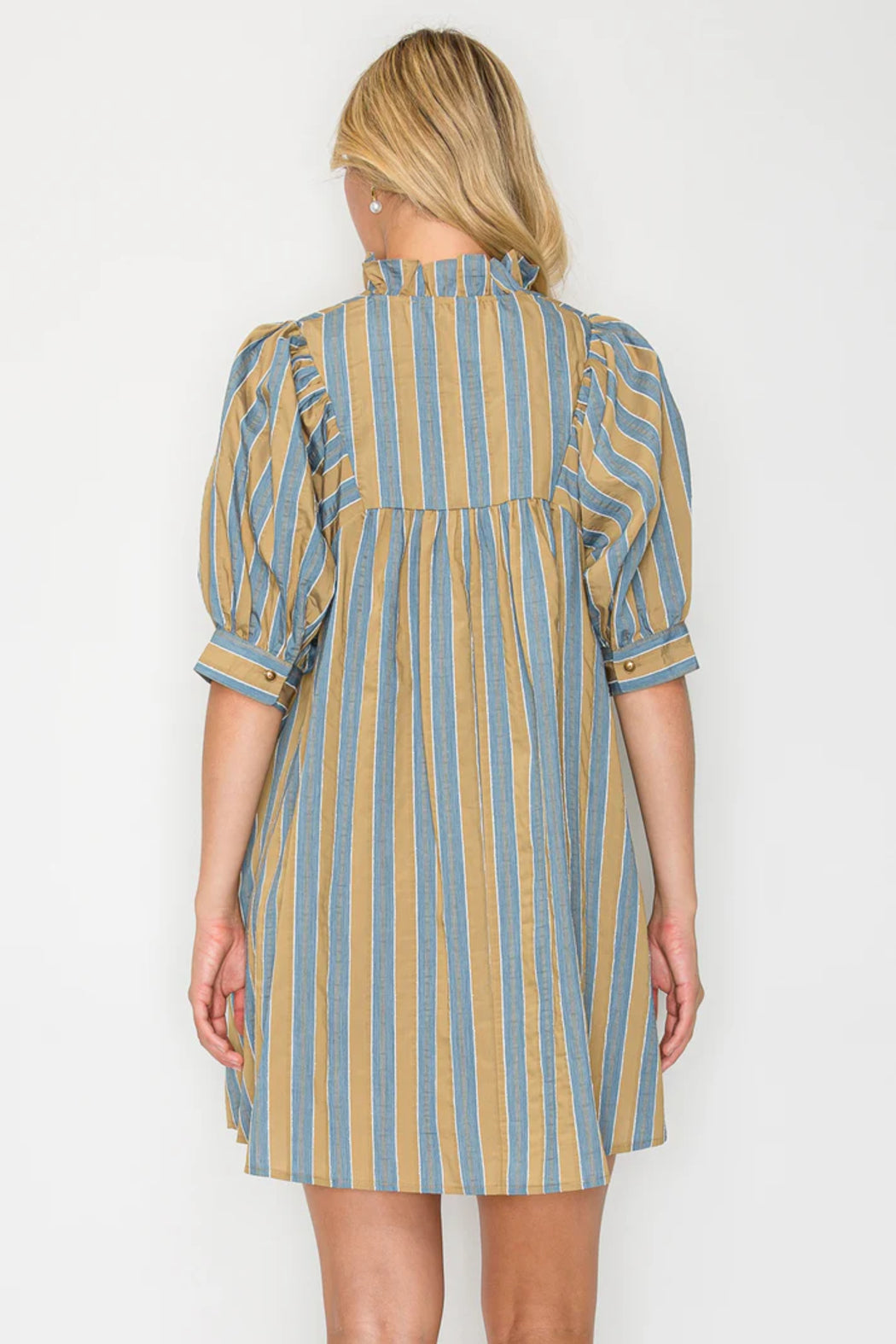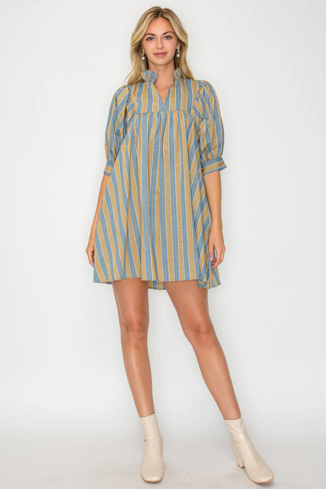 This effortlessly chic striped mini dress is a vision of relaxed sophistication. The elegant, ruffled split-neck collar and voluminous puff sleeves create a silhouette that is both romantic and modernly comfortable. Crafted from a crisp, breathable fabric with a flattering babydoll fit, this dress is perfect for a sunny afternoon spent exploring local markets or for a casual, stylish brunch as the crisp fall air rolls in.