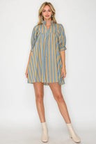 As the summer sun mellows into the golden glow of October, embrace the changing seasons with the Hazel Fall Stripe Short Sleeve Dress. Its beautiful palette of dusty blue and warm hazelnut mirrors the serene landscape of a seaside village preparing for autumn.