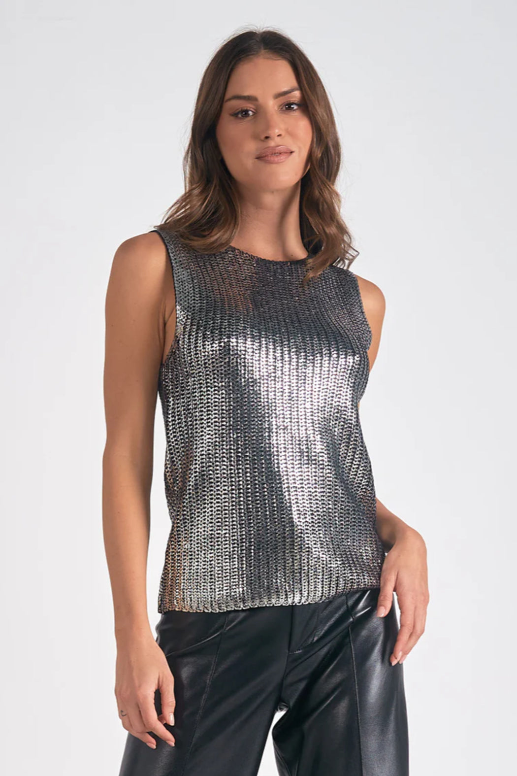 The Raz Sweater brings edgy elegance to your wardrobe. With its metallic knit design and sleeveless crewneck cut, this cool piece is anything but ordinary—a bold and stylish standout!