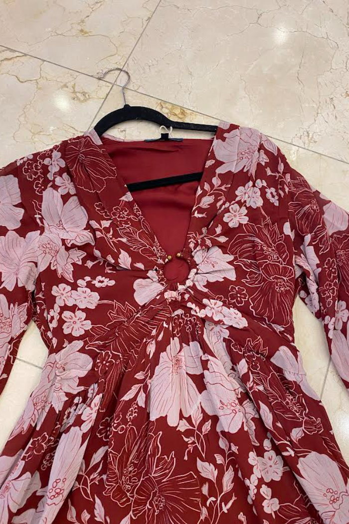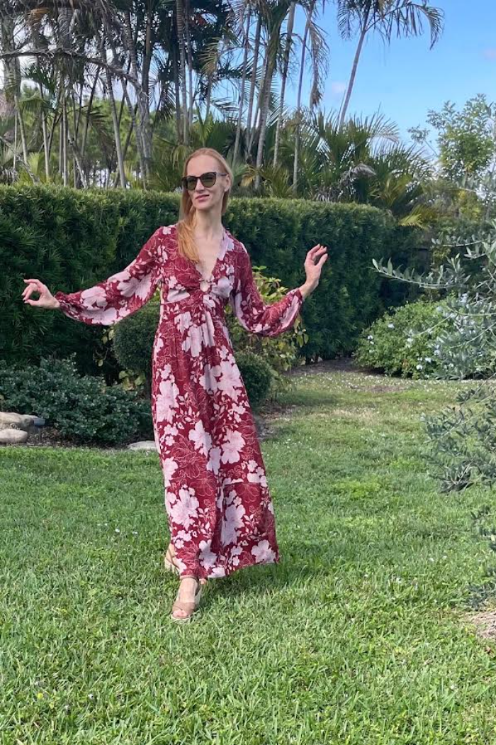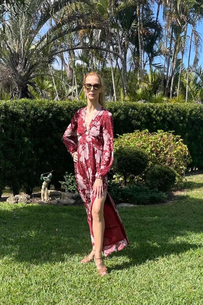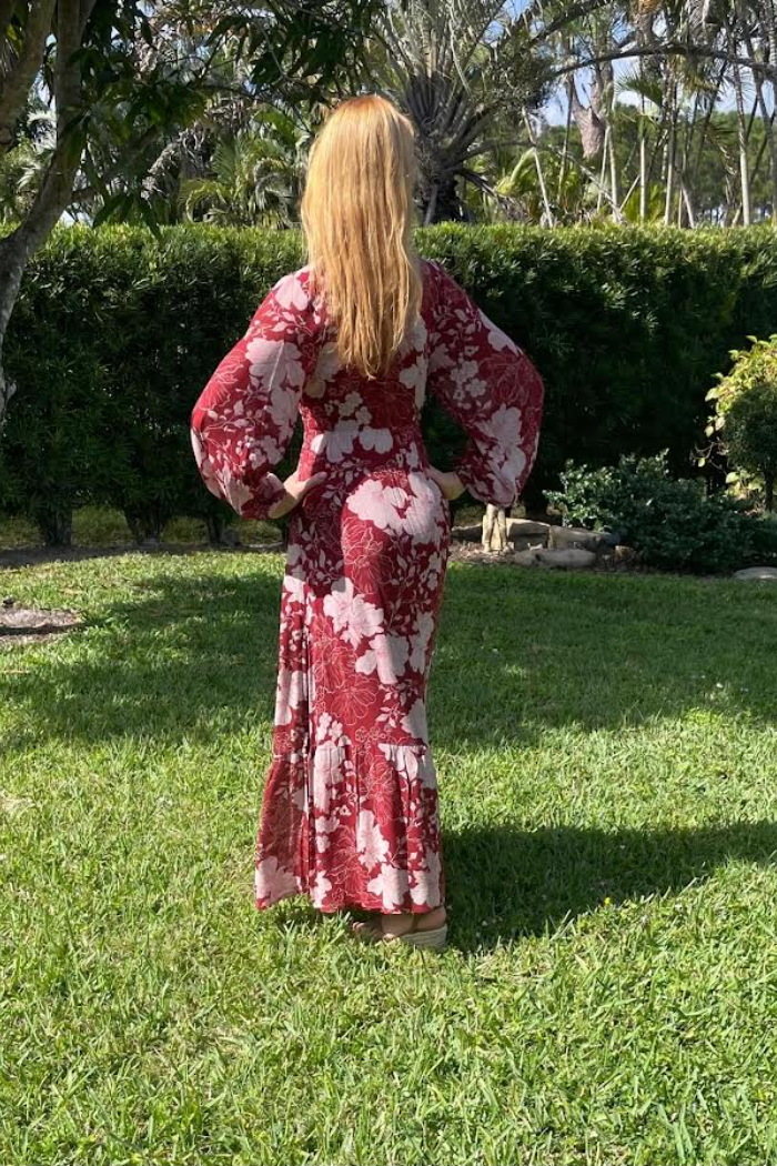 Step into effortless elegance with this beautiful long-sleeve maxi dress, featuring a soft, floral print in shades of dusty mauve and cream. The dress boasts a flattering V-neckline and a gently cinched waist that creates a graceful silhouette. The flowing, slit skirt adds a touch of romance and movement, making it perfect for any special occasion or a casual day out. Crafted from lightweight fabric, this dress offers comfort and style, allowing you to make a statement with ease.