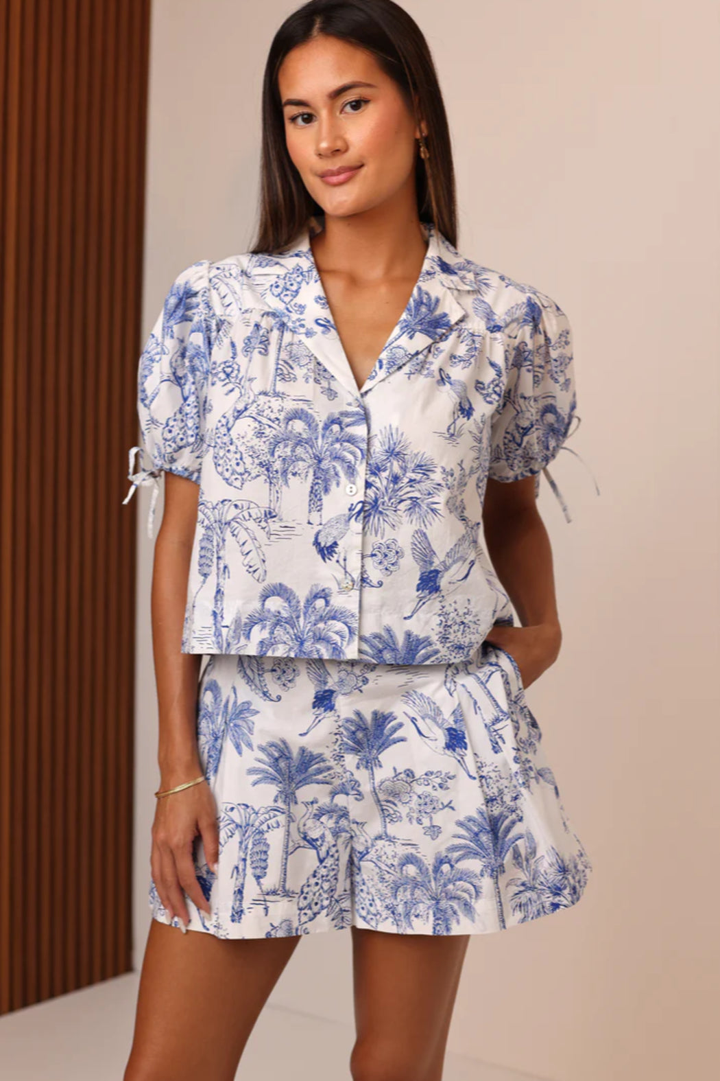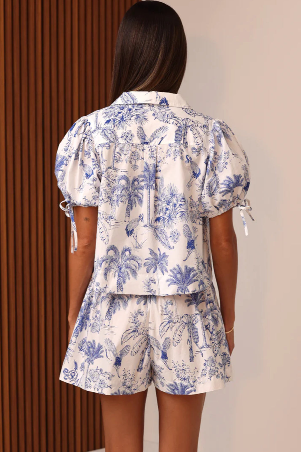Collared button down cropped blouse with tie sleeve detail. Matching with printed buckle short for an effortless look