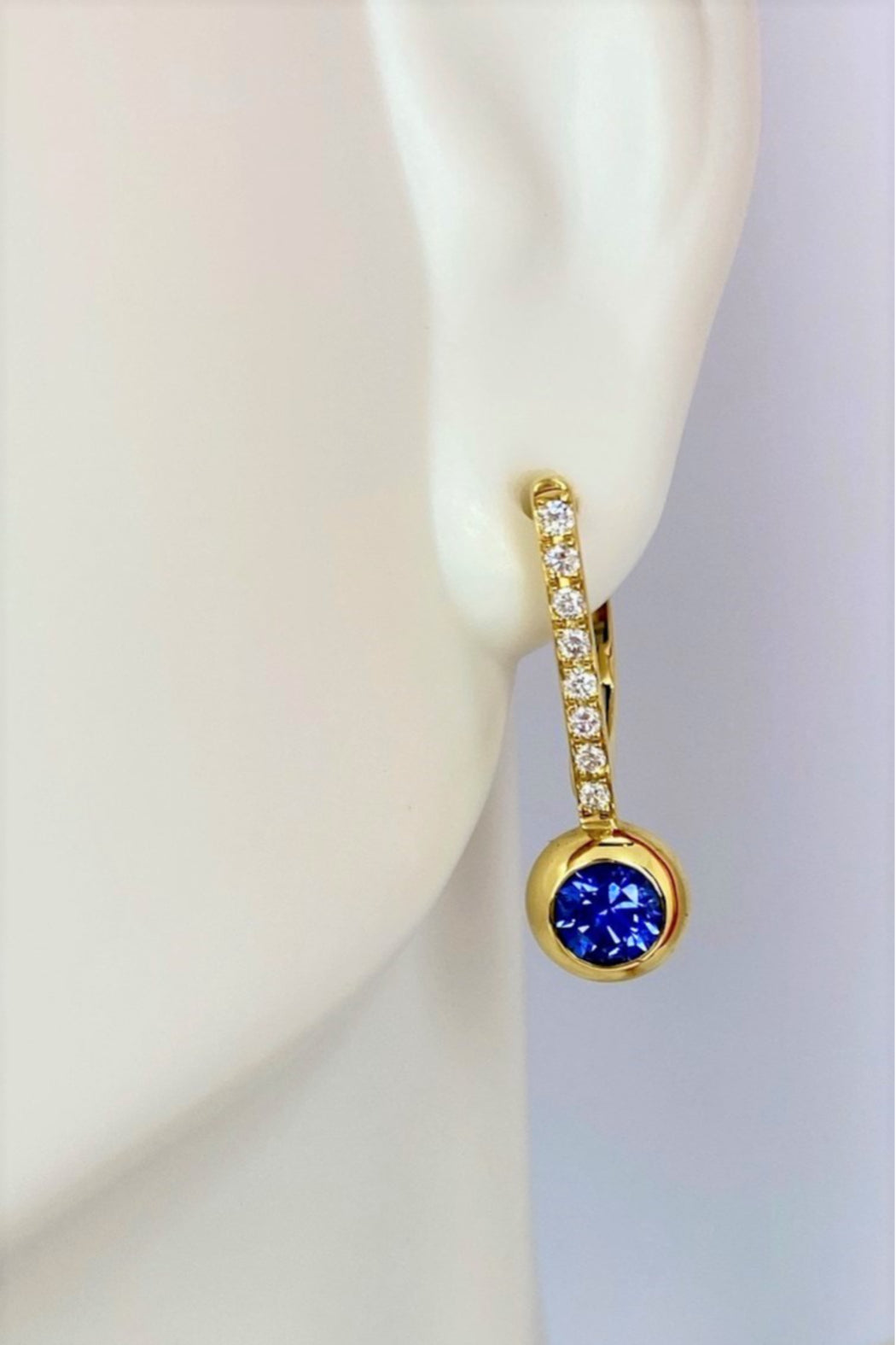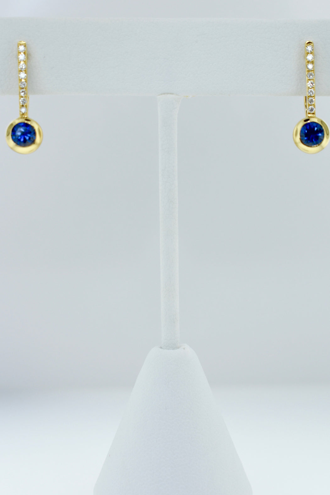 18kt Yellow Gold Bezel Set Blue Sapphire (.82cttw) & Diamond (.15cttw) Earrings with secure lever backs.