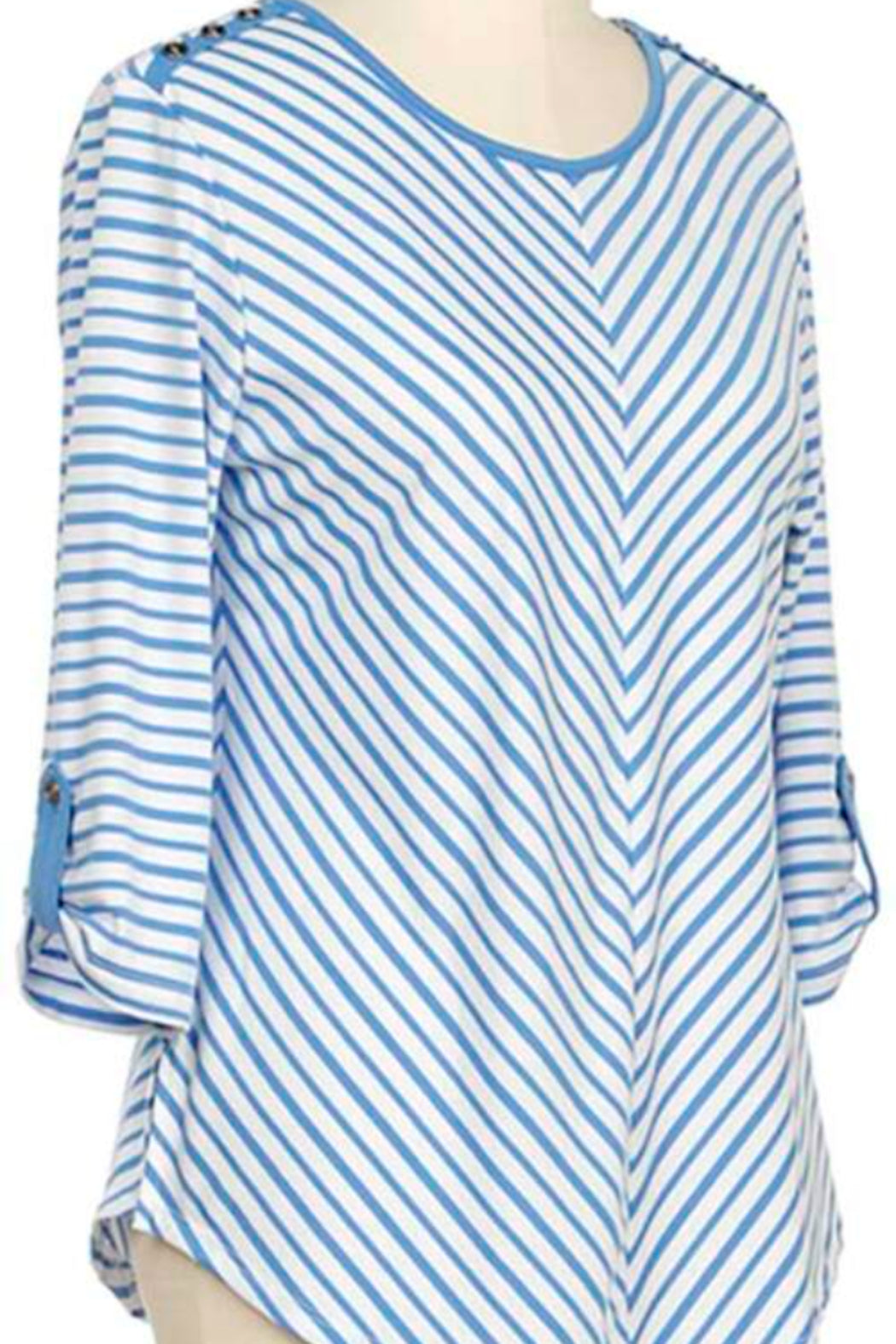 This 3/4 sleeve stripe top has comfort and style written all over it. It features a a rounded neckline, rounded hemline, and shoulder button detail.