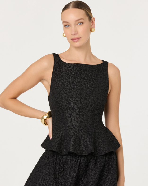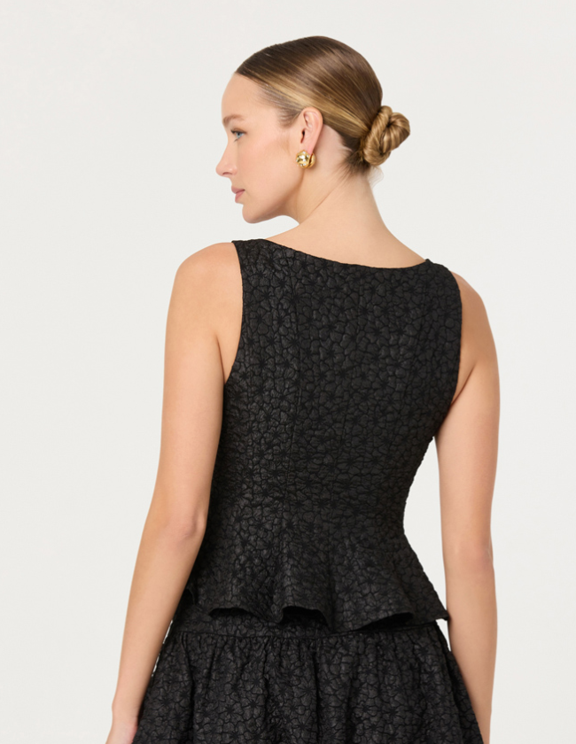 This sophisticated sleeveless top features a flattering square neckline and a tailored bodice that flows into a delicate peplum hem. The black fabric has a subtle, all-over textured pattern that adds depth and luxurious dimension to the top.