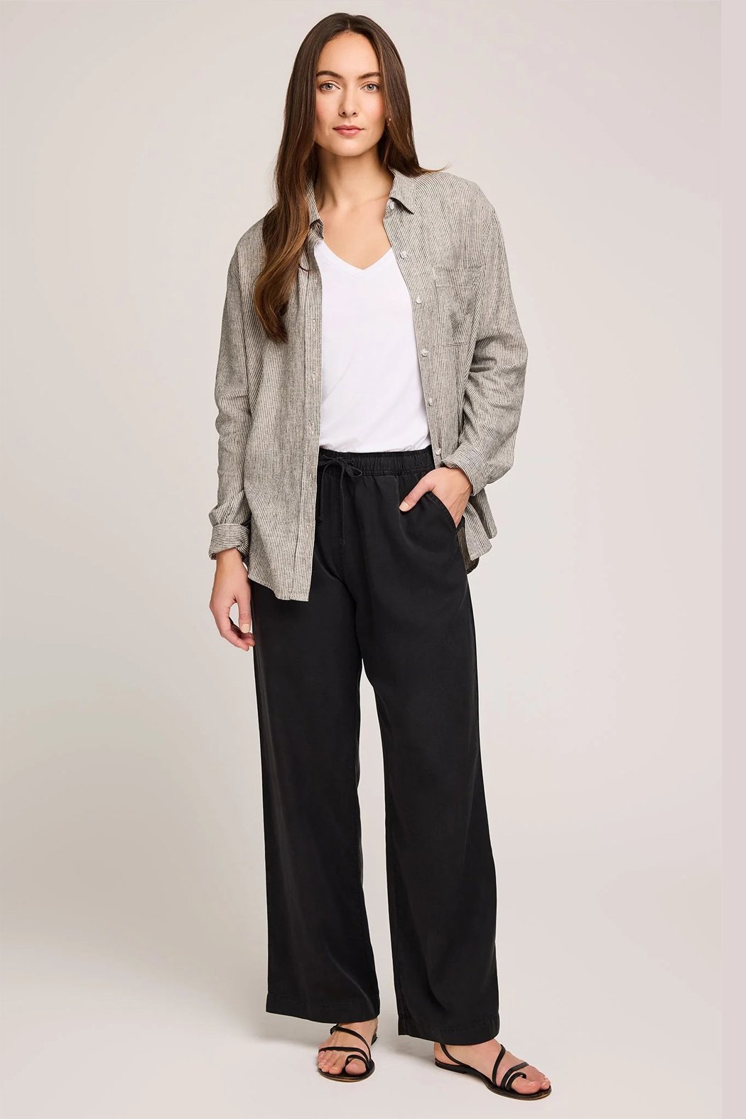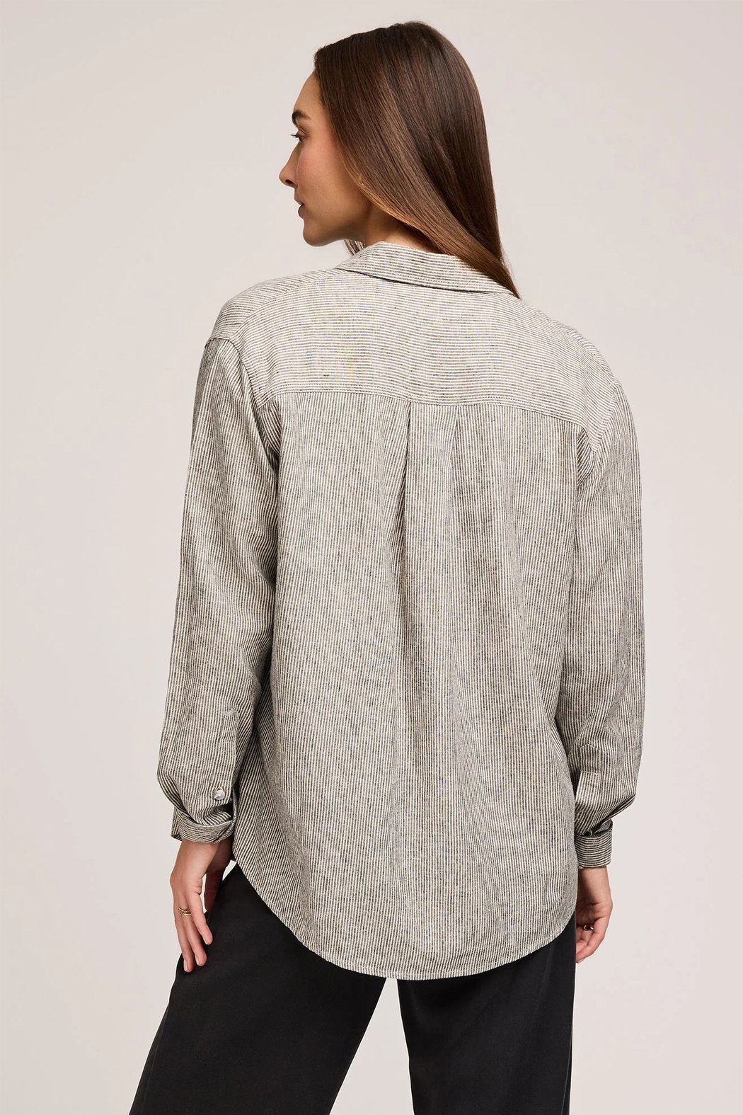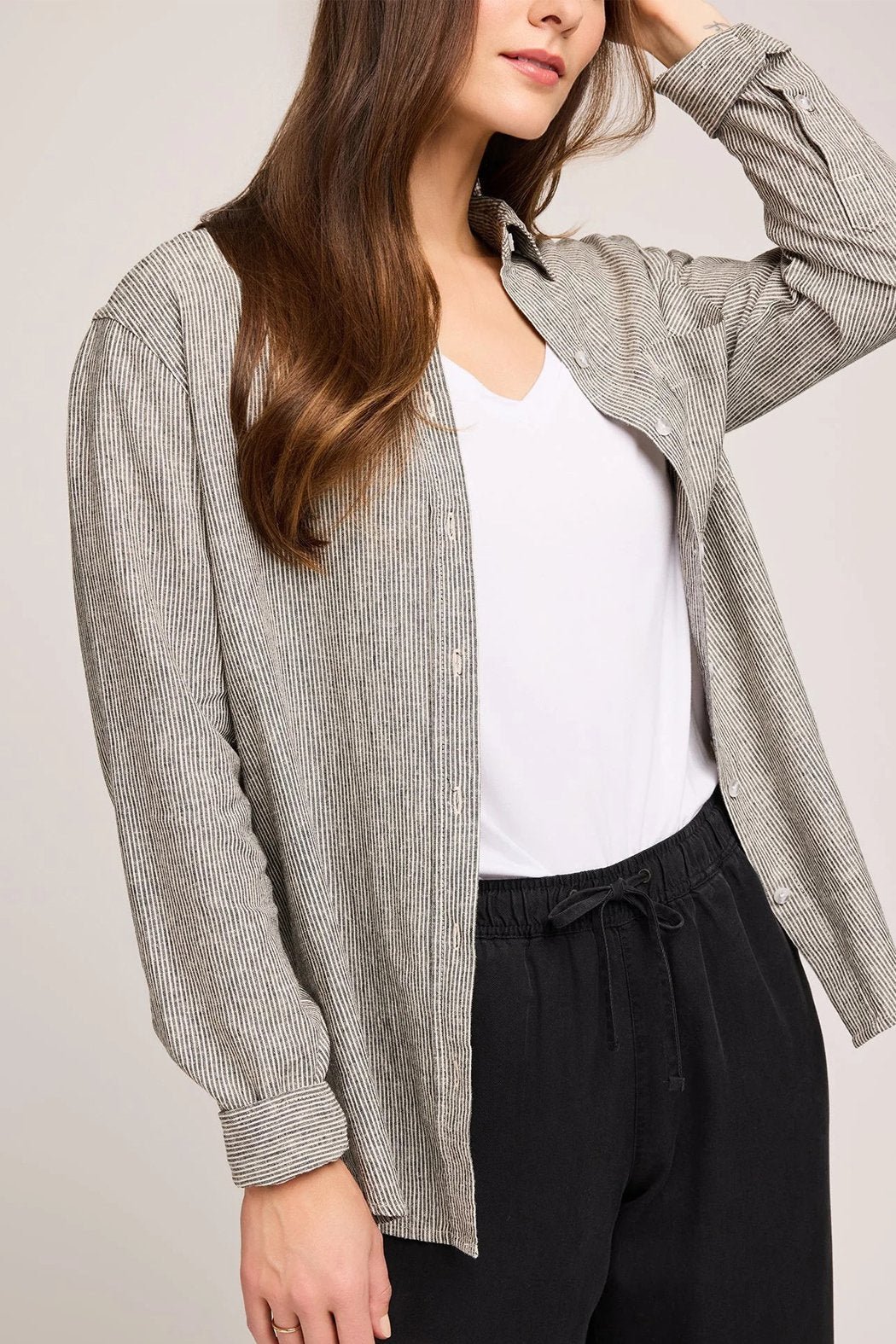 The Arabella button down shirt is made of a linen blend fabric in a yarn-dyed stripe. Features include a patch pocket and side slits. Wear it buttoned up or worn open as a light layering piece. Pair with the Ellie Pant for a complete set.