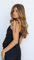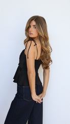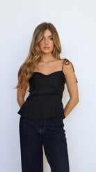 Turn up the charm with the Selina Peplum Top, a romantic wardrobe staple in classic black. Designed with a sweetheart neckline, ruched bust, and a structured boned bodice, this top accentuates your shape in all the right ways. Adjustable tie straps and a smocked back offer a comfortable, flexible fit, while the fully lined construction (exclusive of smocking) adds a smooth, finished feel.