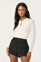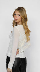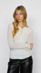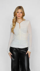 Elevate your essentials with this flattering ruched, long sleeve top. A subtle clasp detail completes the neckline with a refined touch, making it the perfect top for your next business meeting, night out with friends or casual weekend errands.