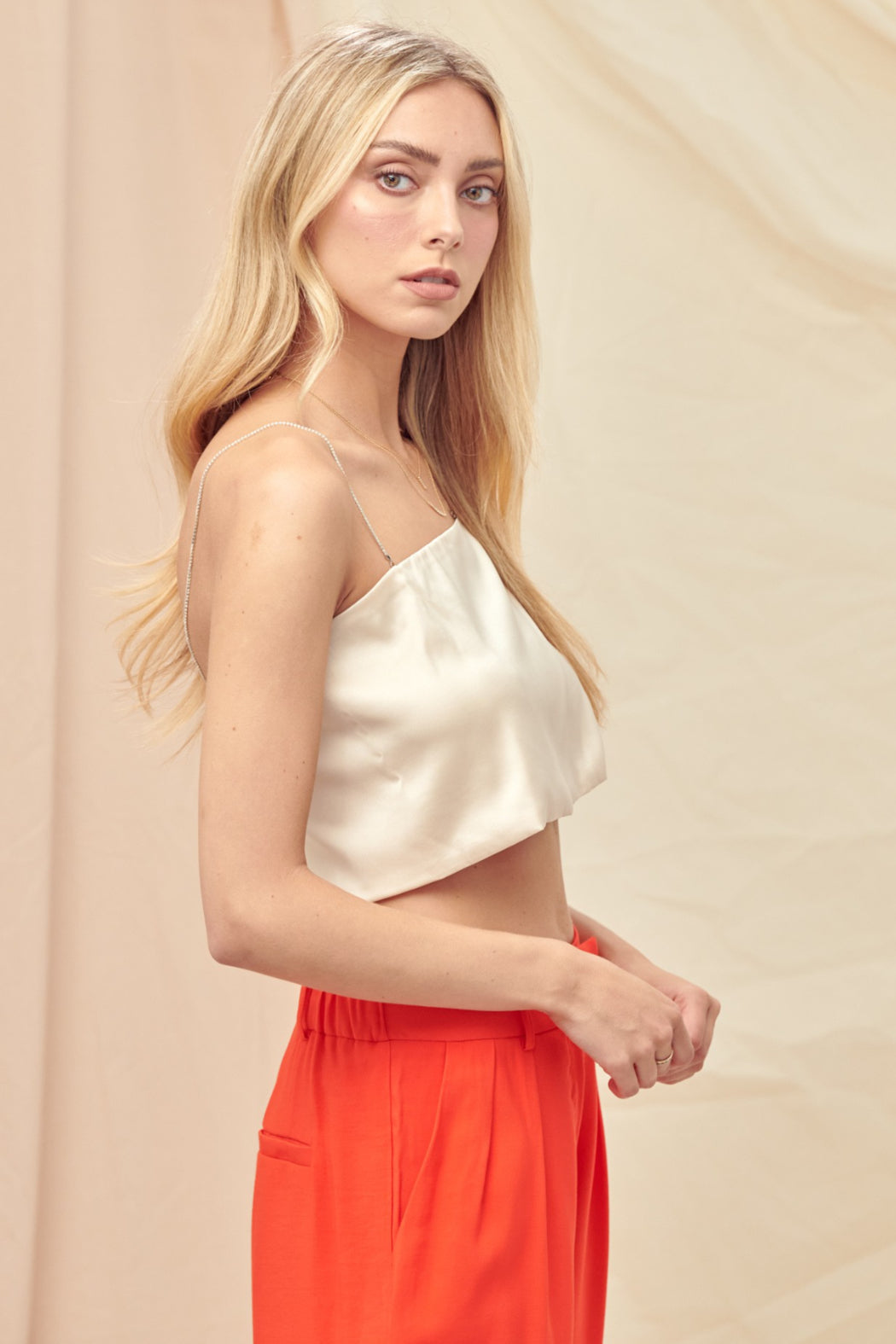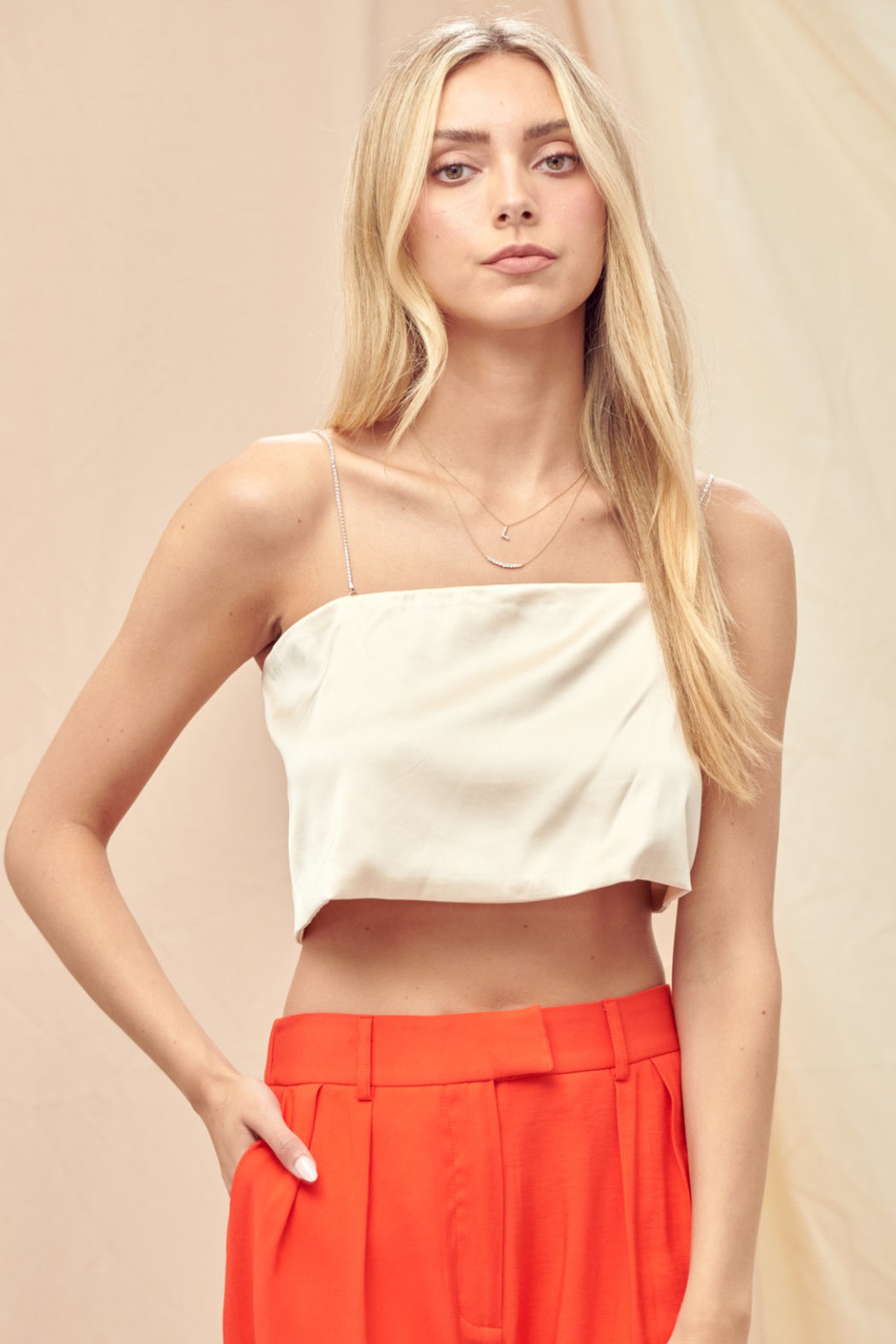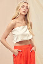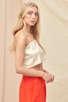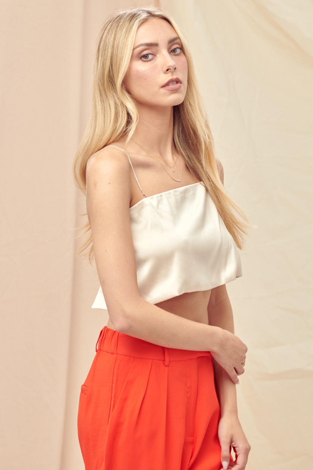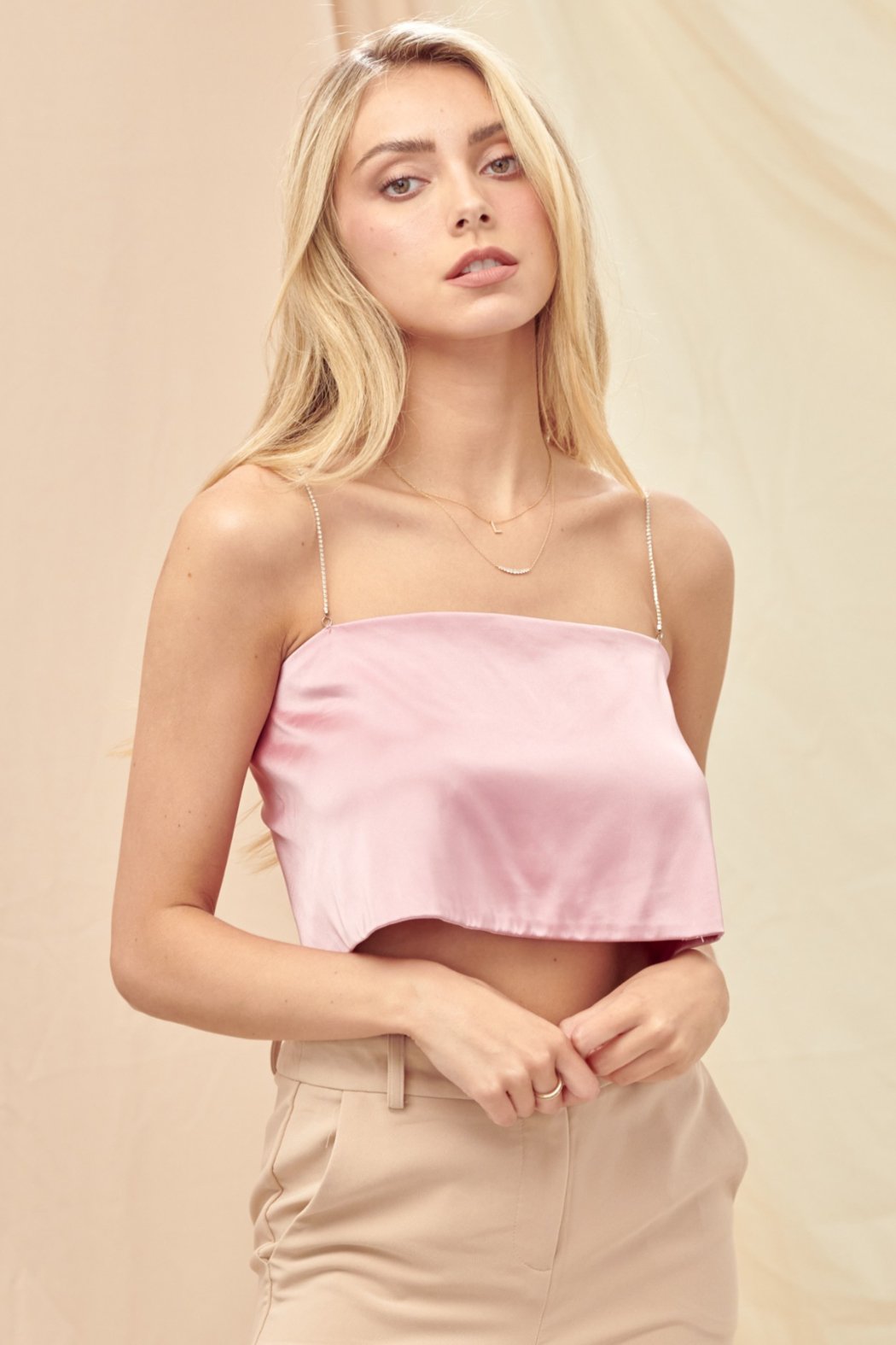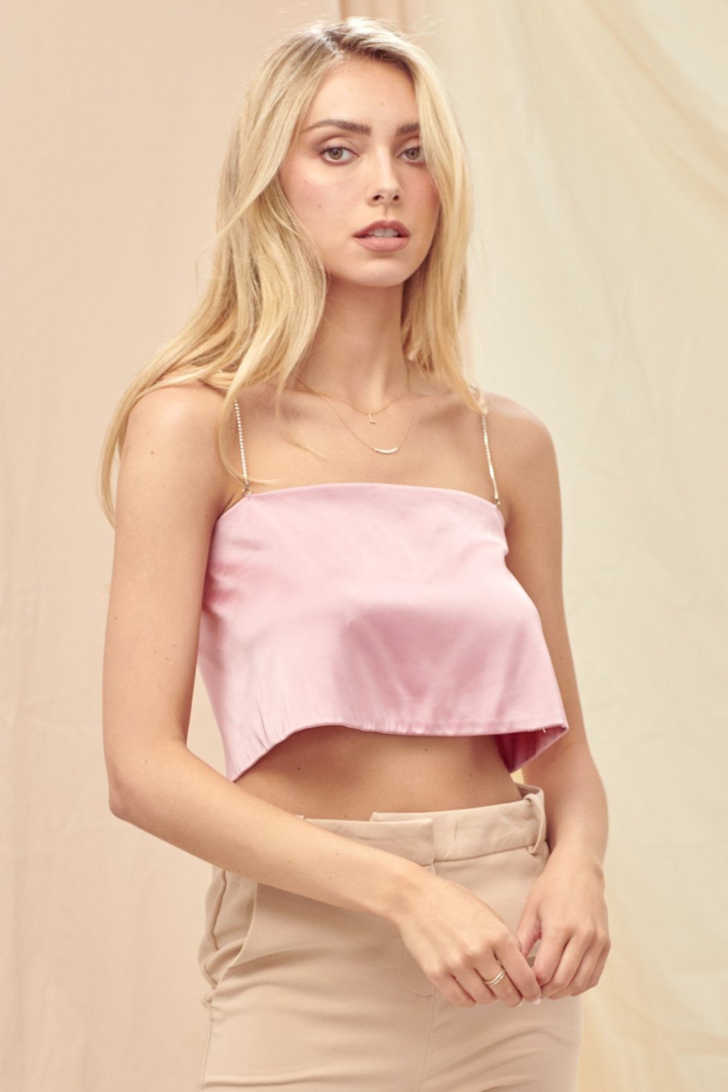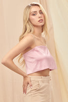 Shine season is calling, this satin Barely There Top is your main character moment. Featuring delicate spaghetti straps, an open back, and a rhinestone strap detail that steals the spotlight from every angle. The smooth satin finish drapes like a dream, making it "effortless but make it glam" piece you'll reach for again and again. Perfect for holiday parties, nights out, or anytime you want to look like the best-dressed person in the room.