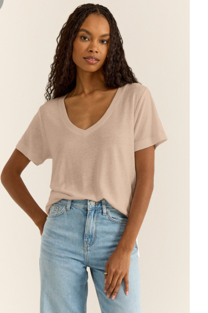 V-neckline Short sleeve tee Side seam rib detail Side seam slit Length from shoulder 24" Relaxed fit Linen Blend Slub: 55% Linen, 45% Rayon