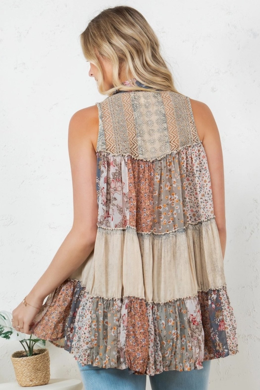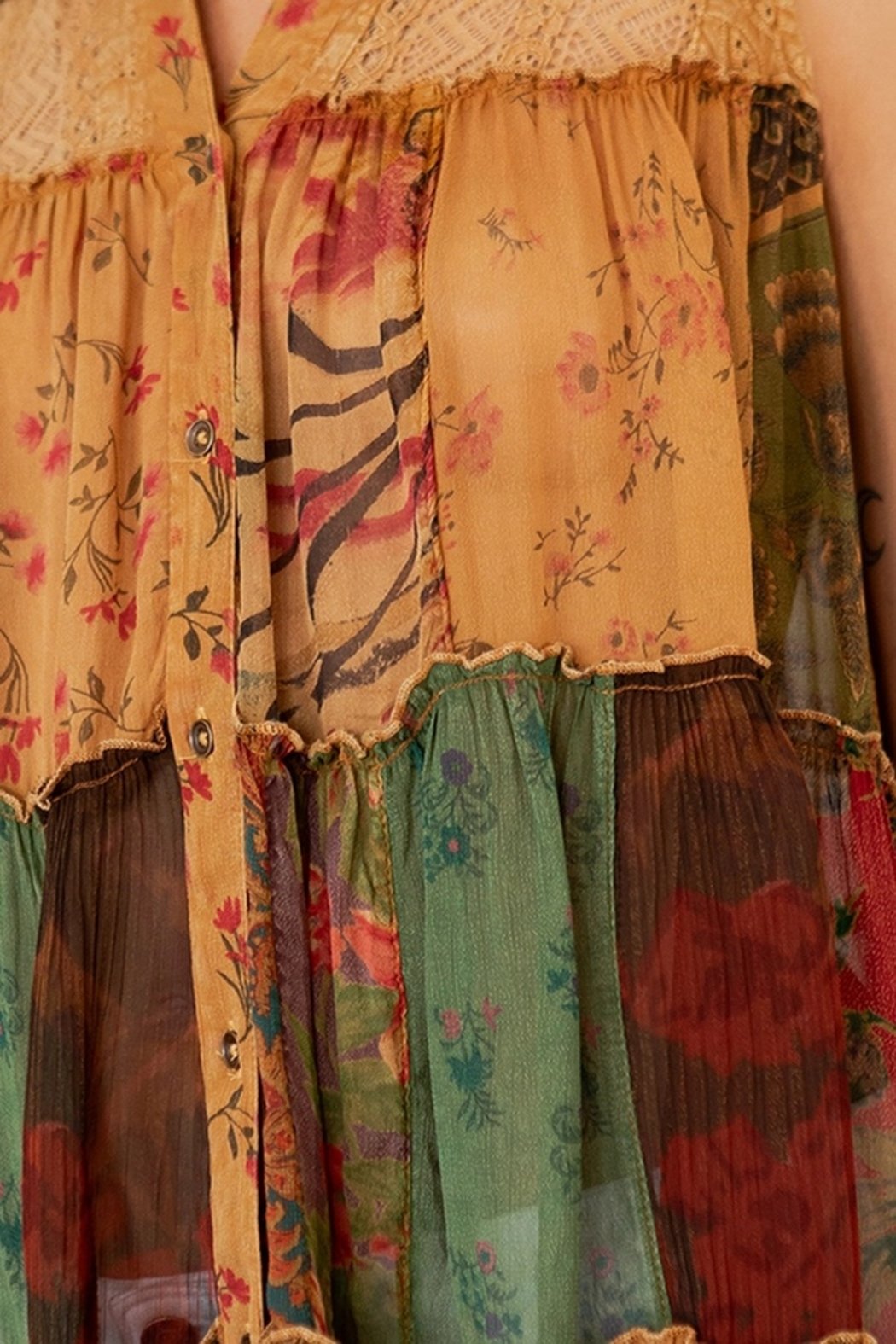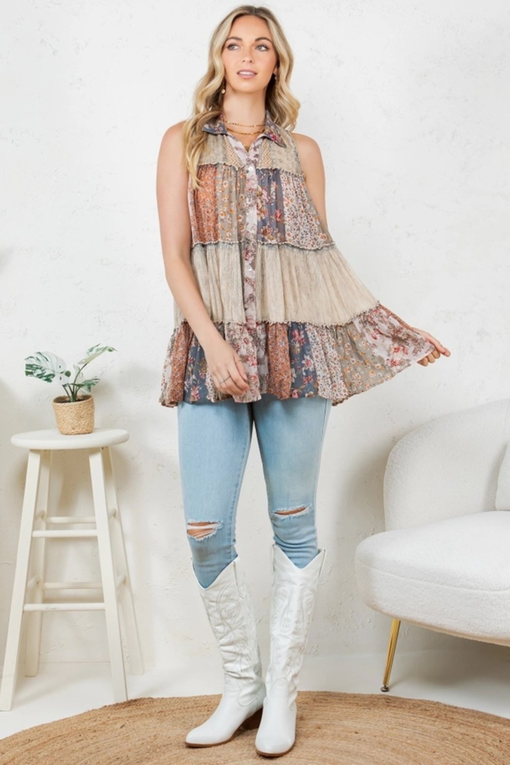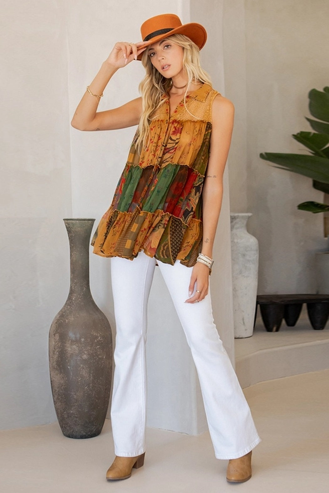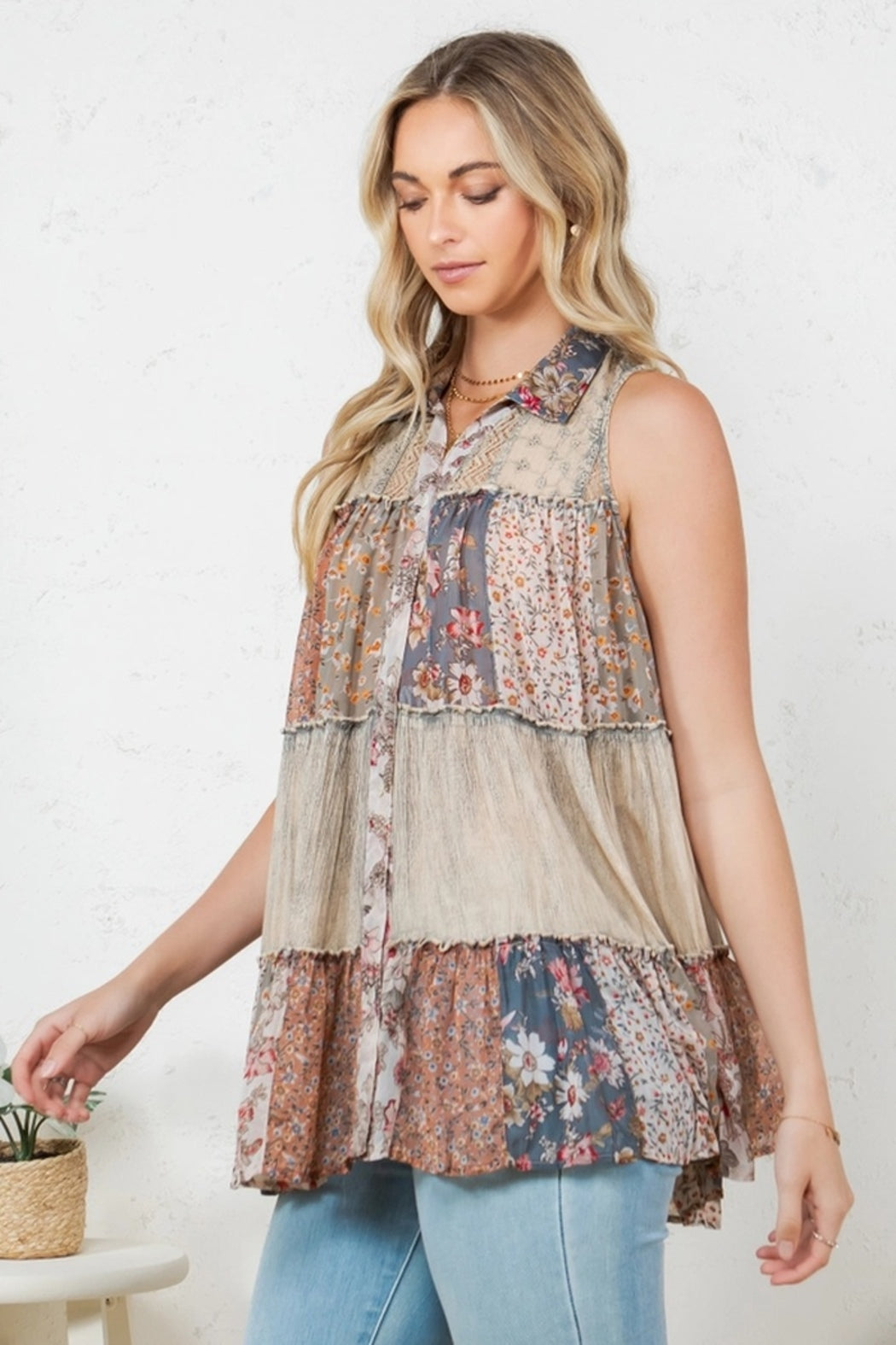 Keywords: boho patchwork top, lace yoke blouse, sleeveless shirt collar, summer festival top, artsy bohemian blouse, flowy patchwork shirt