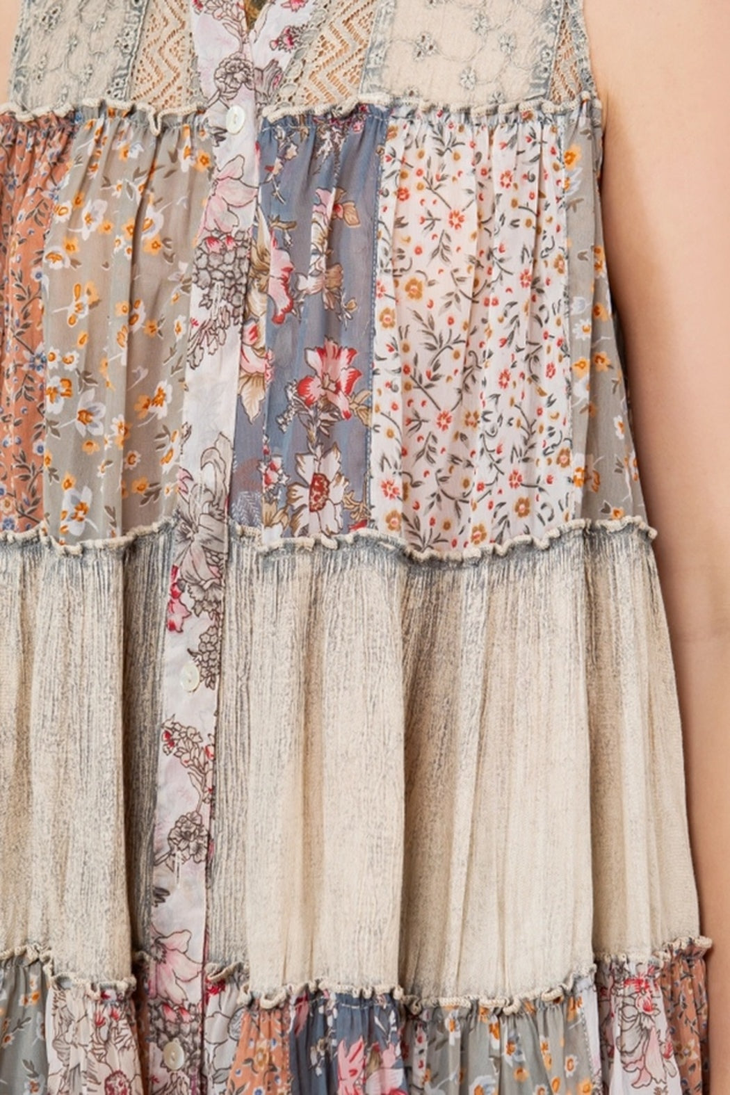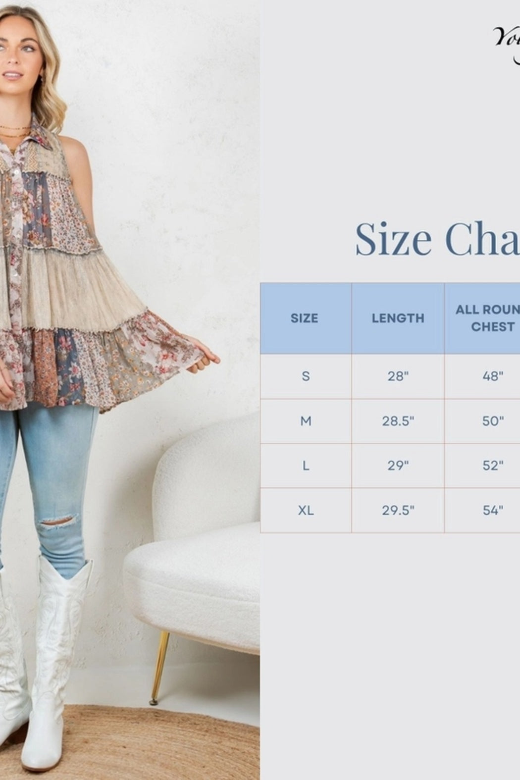 Bring vibrant artistry to your wardrobe with this sleeveless boho patchwork top, featuring a shirt collar neckline and a free-flowing silhouette. The intricate patchwork panels are paired with delicate lace inserts at the front and back yoke, blending texture and femininity. A front button-down closure with metal buttons adds a touch of polish, while the lightweight, breezy fabric makes it perfect for warm-weather layering.