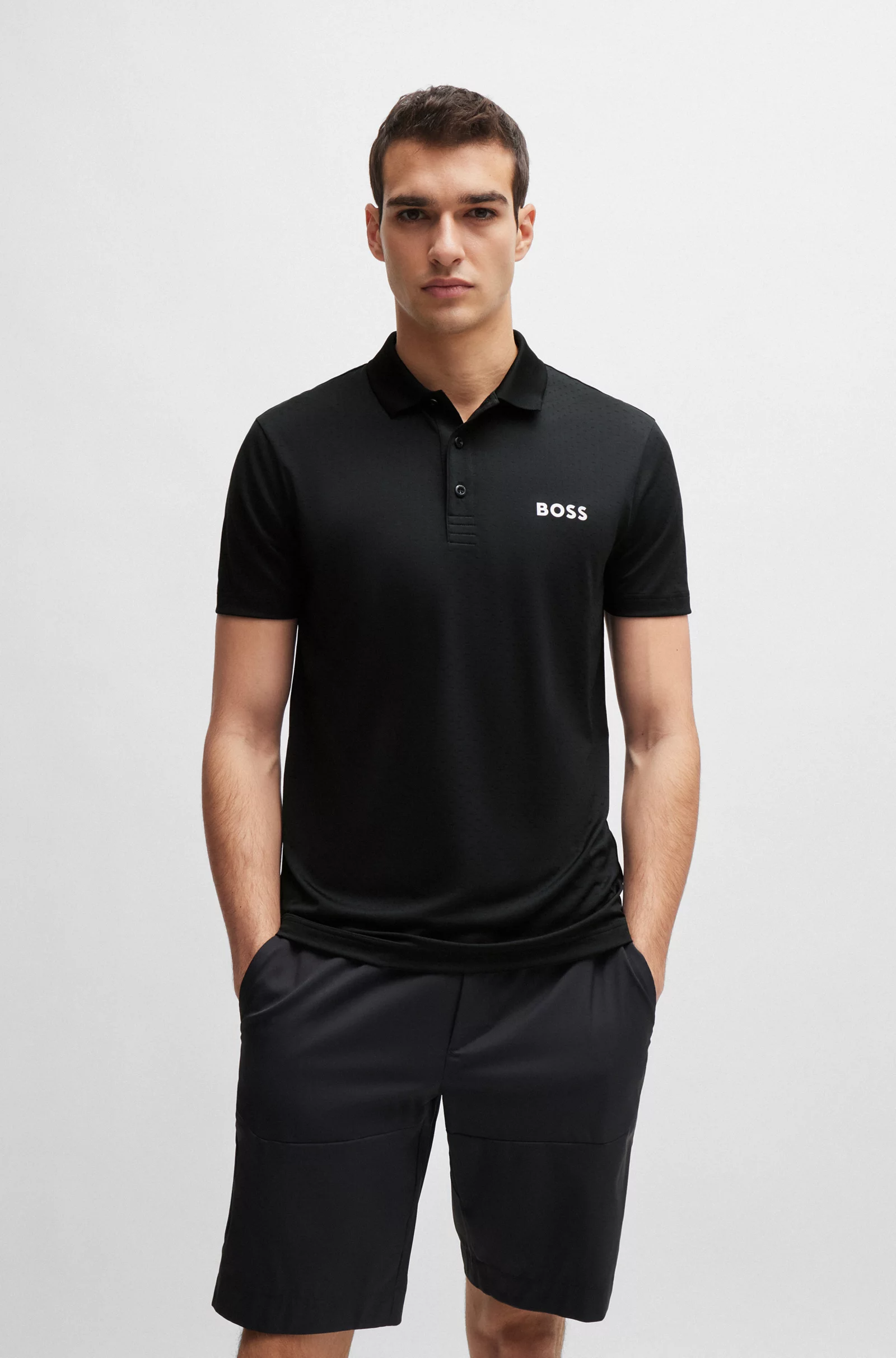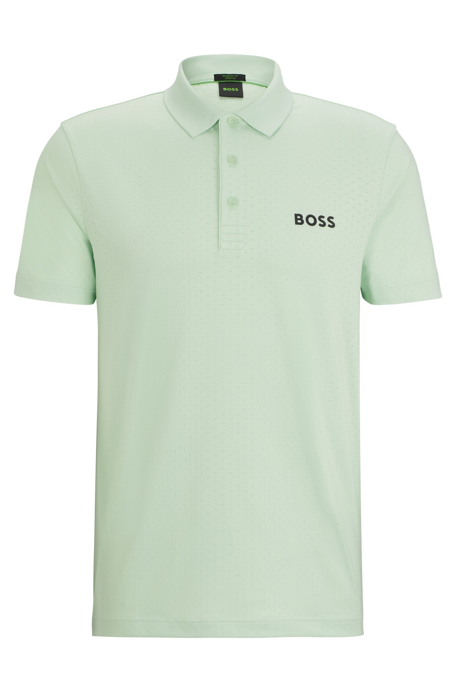 This BOSS Menswear polo shirt boasts advanced features such as quick-drying degradé jacquard fabric, moisture control, and four-way stretch for optimal performance. Its regular fit is complemented by a flat-knit collar and three buttons, while the short sleeves and standard length add to its versatility.