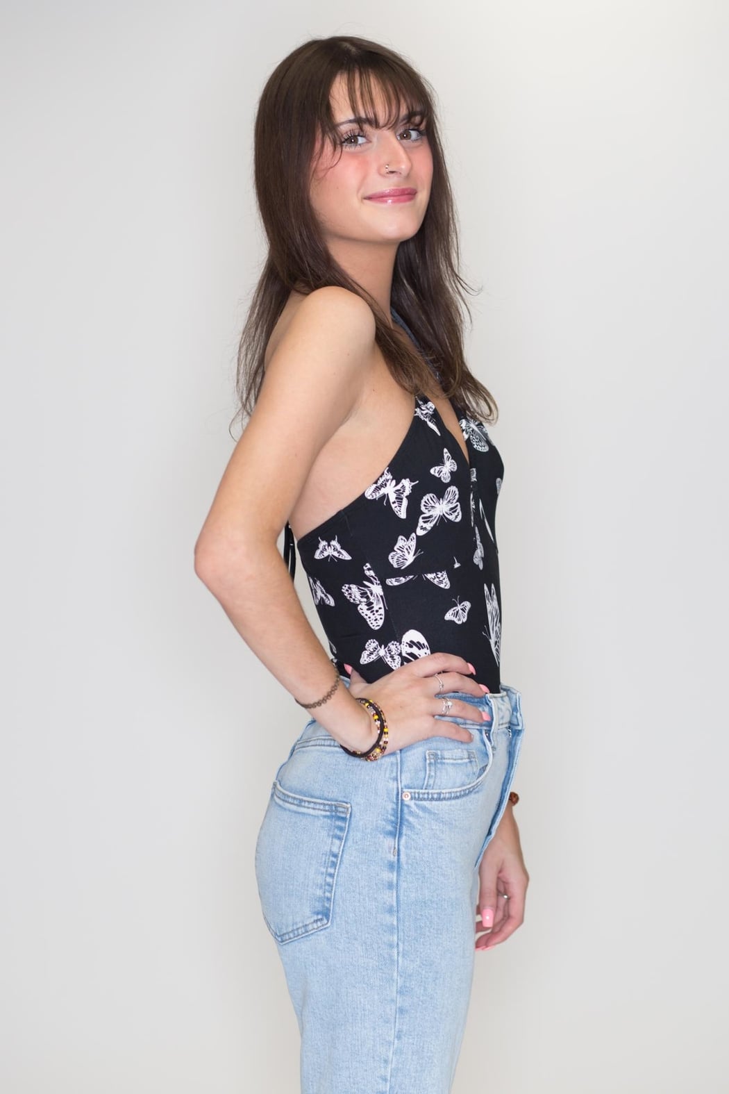 Black butterfly print bodysuit with halter neck and bottom snap closure.