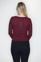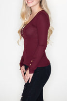 Soft fine cotton knit button down top. Fitted plum henley with long sleeves and button details.
