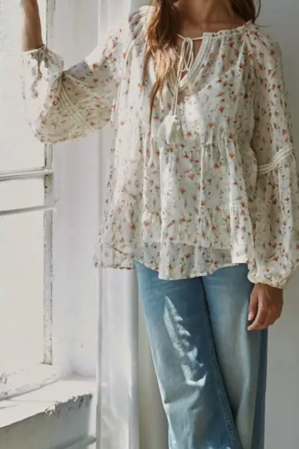 Beautiful boho floral blouse. This top matches perfectly with denim.