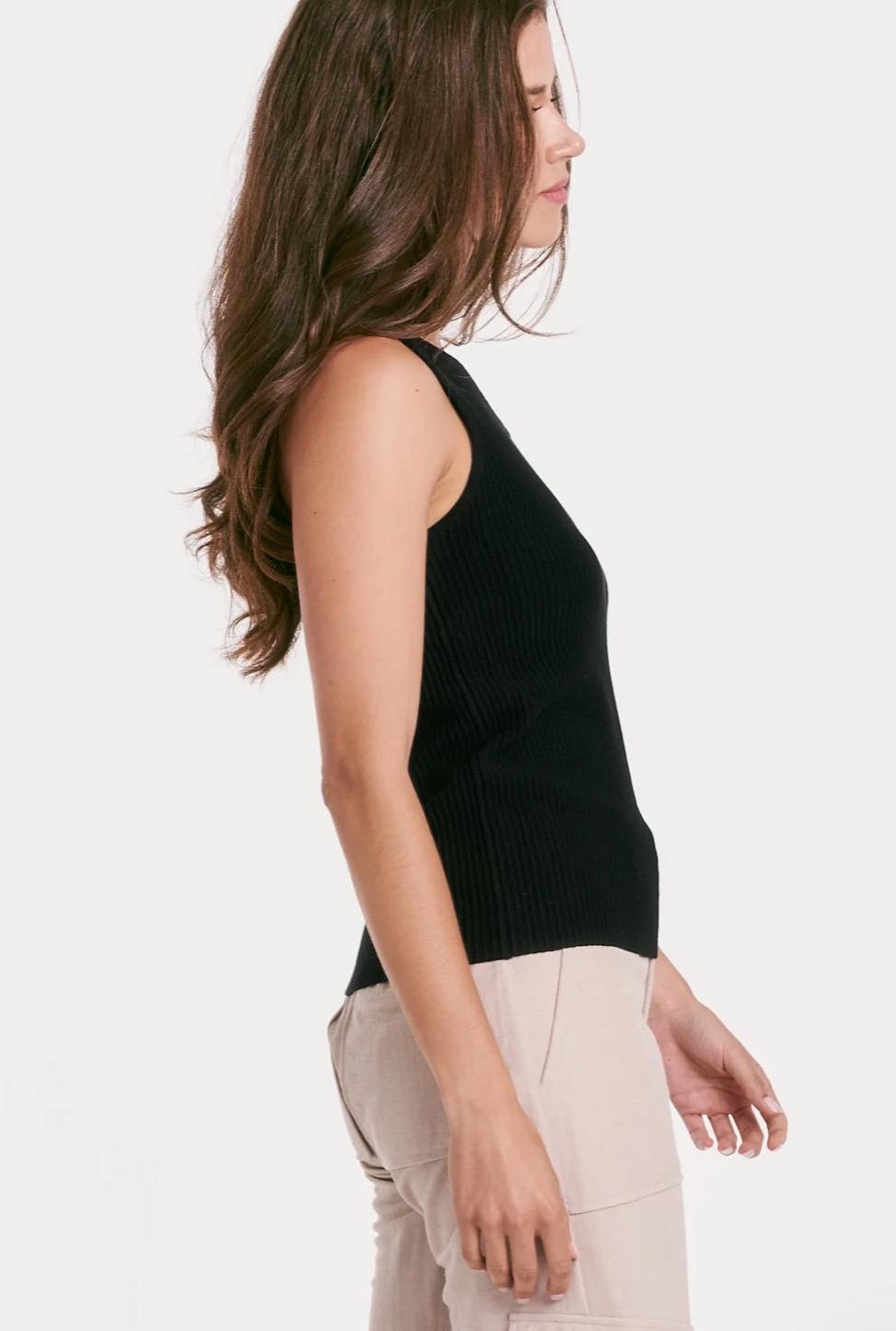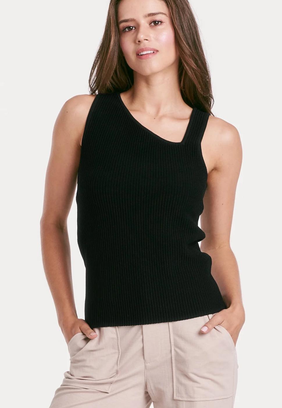 A elevated basic for your closet. Shoulder cut out ribbed tank, asymmetrical neckline with weaved self neck band & hem.