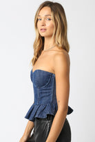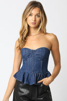 This Cindy Denim Top is a cool-girl staple with a playful edge. It's a strapless denim bustier with a sweetheart neckline that flatters and smocked sides for comfort and flexibility. The ruffled peplum hem adds a flirty, feminine touch, while the zipper closure at the back keeps it sleek and easy to wear. Perfect for going-out looks, brunch with friends, casual date nights, and music festivals.