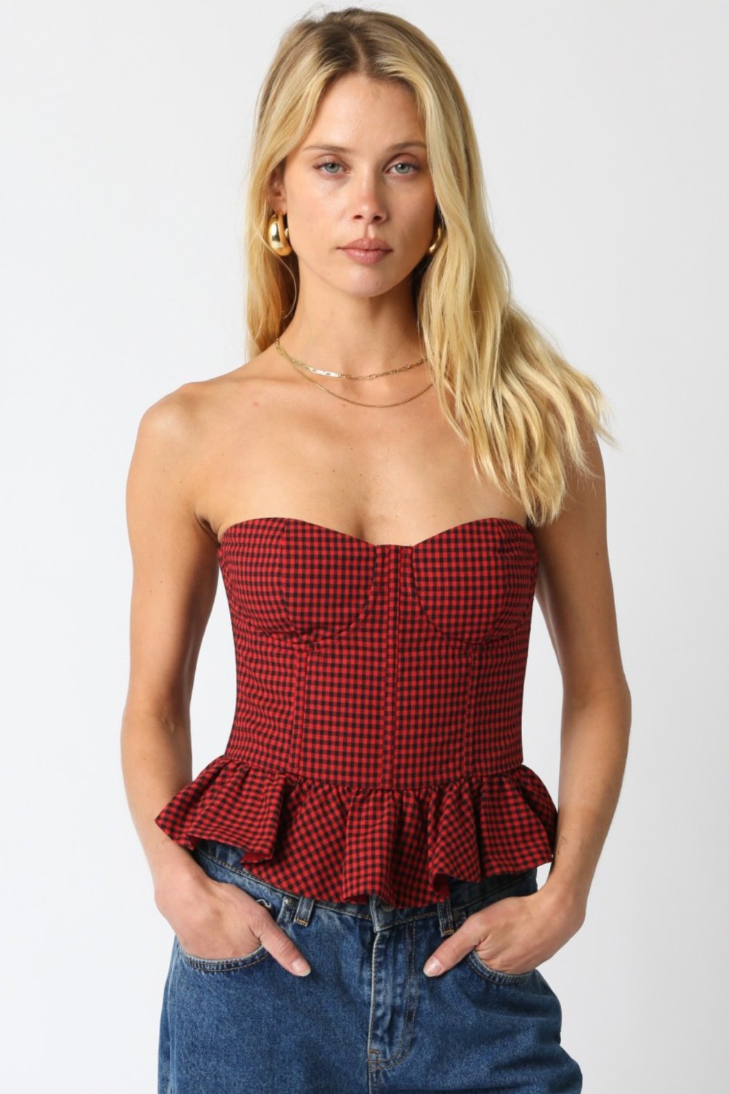 A little vintage crush, a little drama. This Cindy Gingham Top isn't here to play it safe. In a bold black-and-red gingham print, this strapless piece features a sweetheart neckline that flatters effortlessly and finishes with a ruffled hem that flirts just enough. Perfect for concerts, casual evening dates, or girls' nights out.