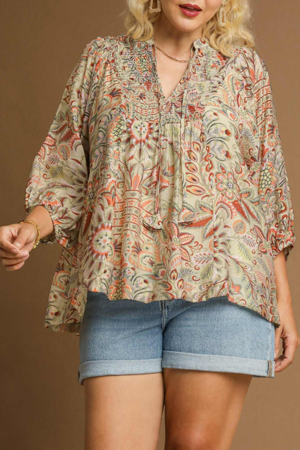 Floral print top with 3/4 sleeve and round collar with v-neck and tie. Refer to measurements for your perfect fit.