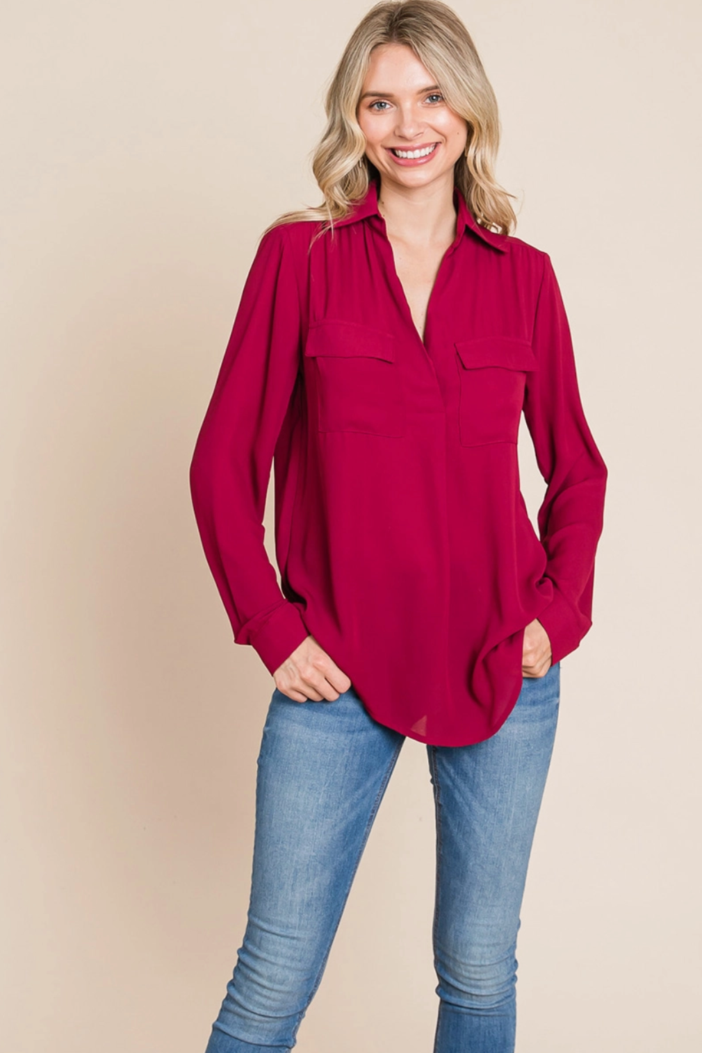 Features: Long Sleeve, V neck, Collared, 2 Front Pockets, One button front in order to make the neck line longer, Solid Color