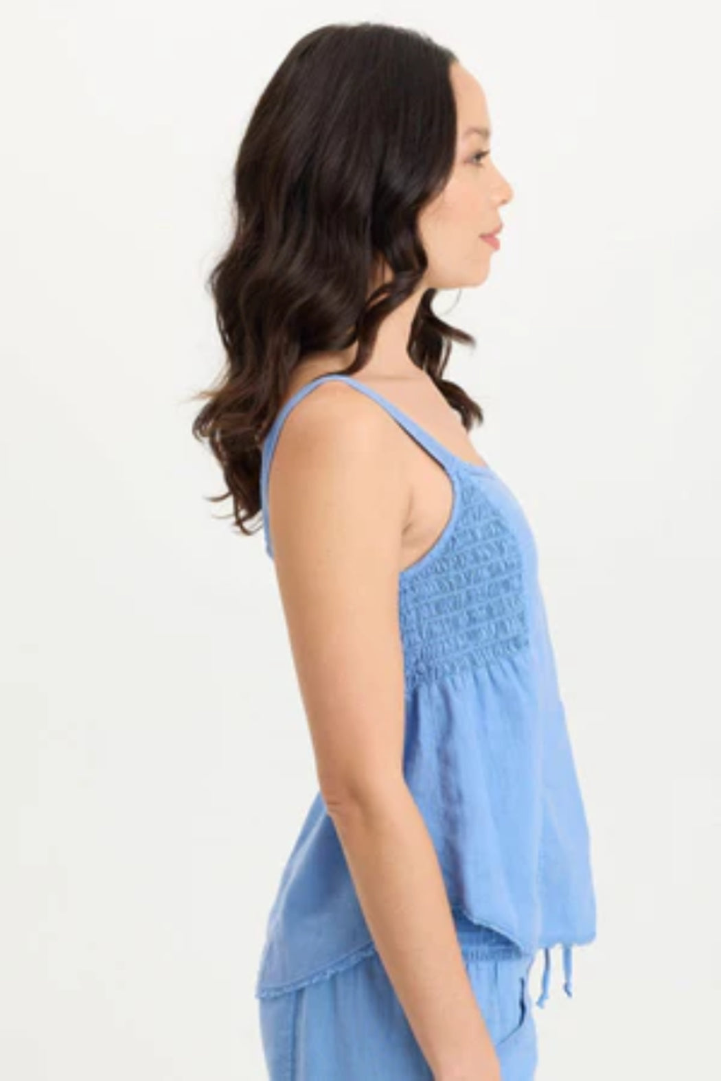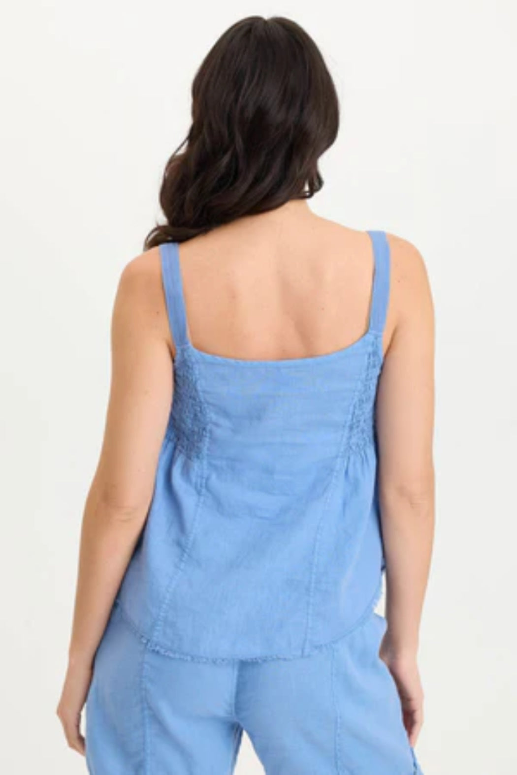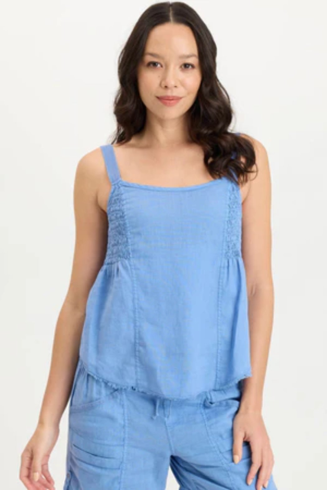 Ruched along the side seams, Fernley is an a-lined tank with rounded hem and twill tape straps. -Lavish Linen: 78/22 Linen/Cotton -Center Front (~in): ~17" -Center Back (~in): ~17.5" -Color Description: Clean Mid-Tone Sky Blue -Preshrunk -Machine washable -Imported