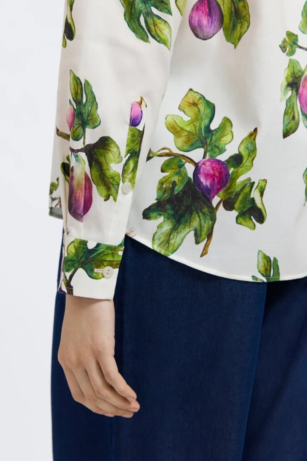 A fresh spin on a longtime favorite. Hampton has long been loved for its timeless style and effortless fit, and this version brings a touch of whimsy to the classic silhouette in cotton twill. The allover fig print — done in rich, painterly watercolor hues — offers a playful nod to nature. Look closely to spot bumblebees tucked among the fruit, adding a lighthearted touch. And thanks to the one-way print layout, each vignette stands out clearly — no overlapping, just clean, thoughtful design. Chest darts, a back pleat and a gently rounded hem finish the flattering shape.