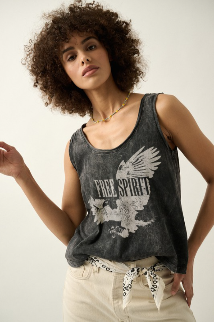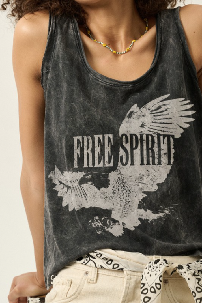 Vintage-style graphic of a flying eagle with "Free Spirit" text print.