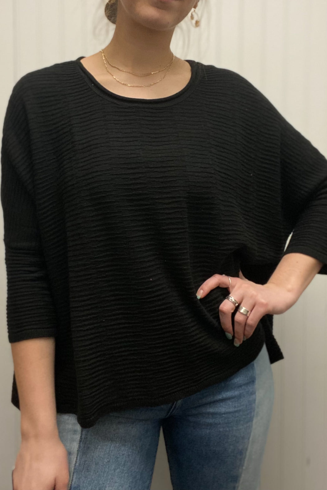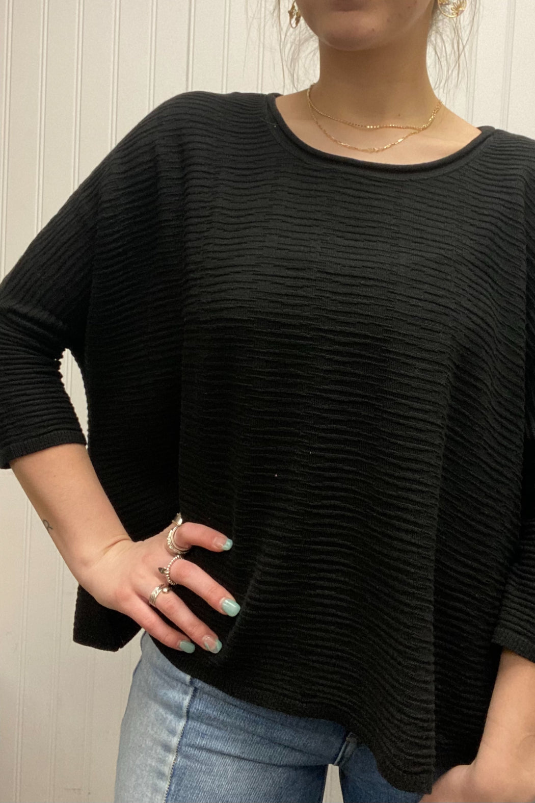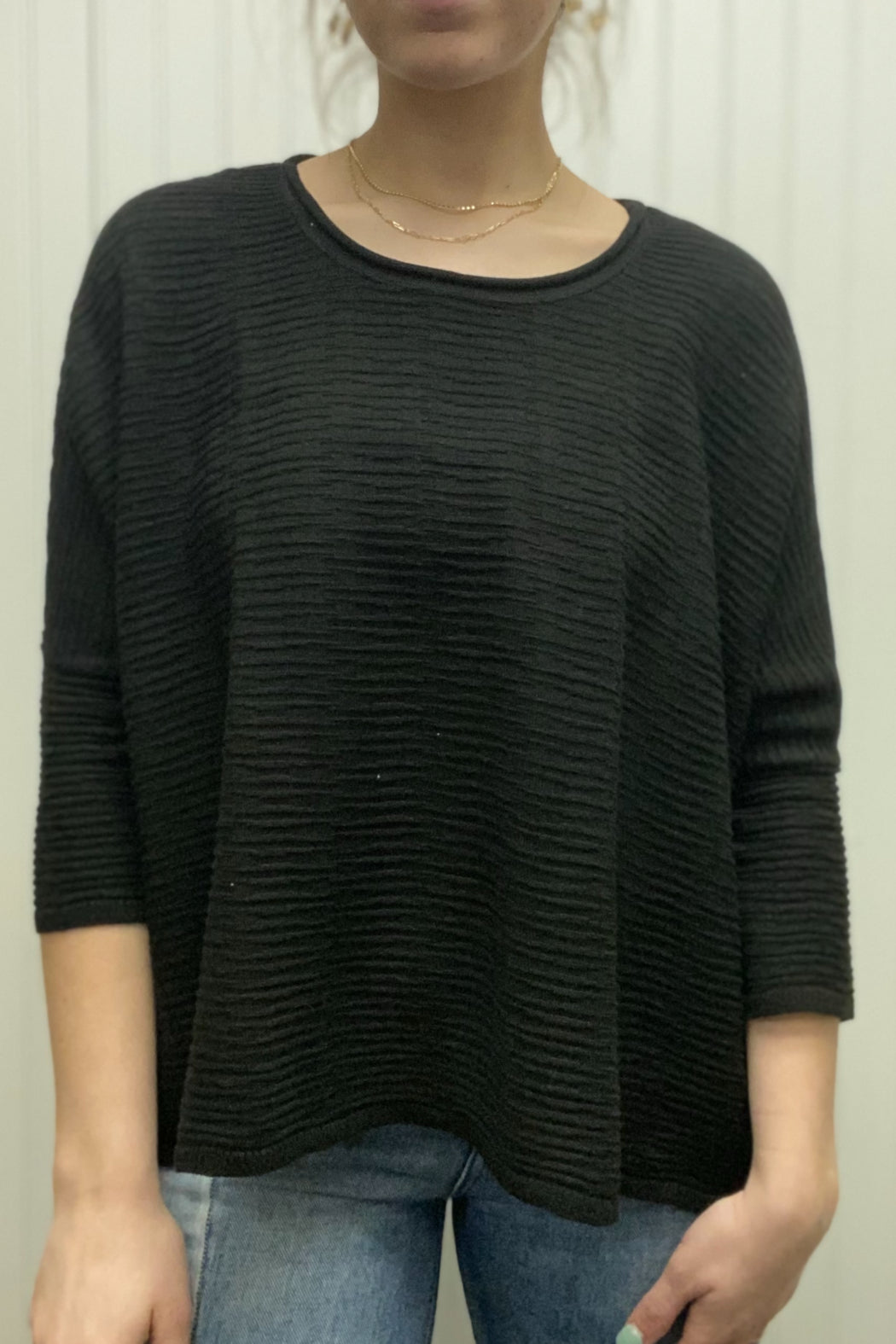 This is a lightweight ribbed sweater that has a tighter sleeve with a boxy body. The length hits right around the waist line.
