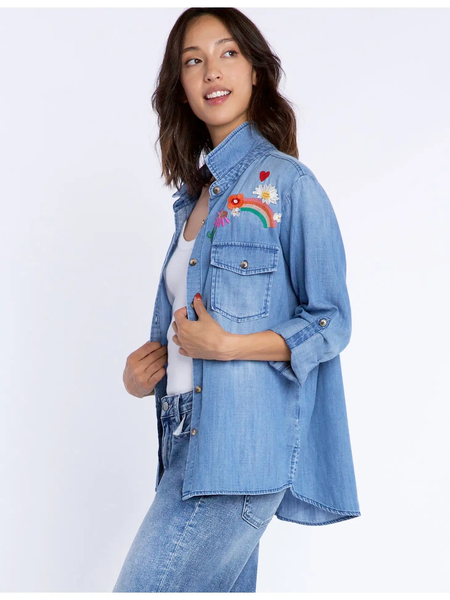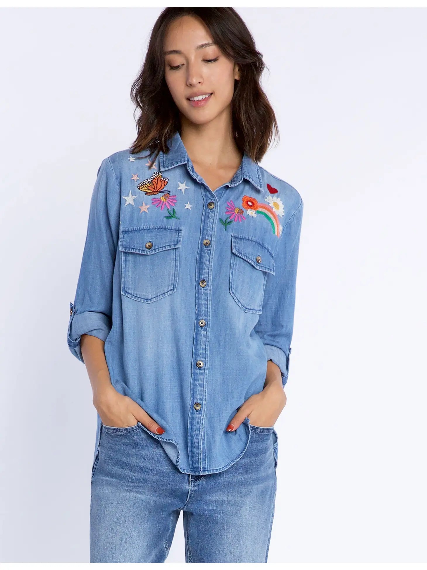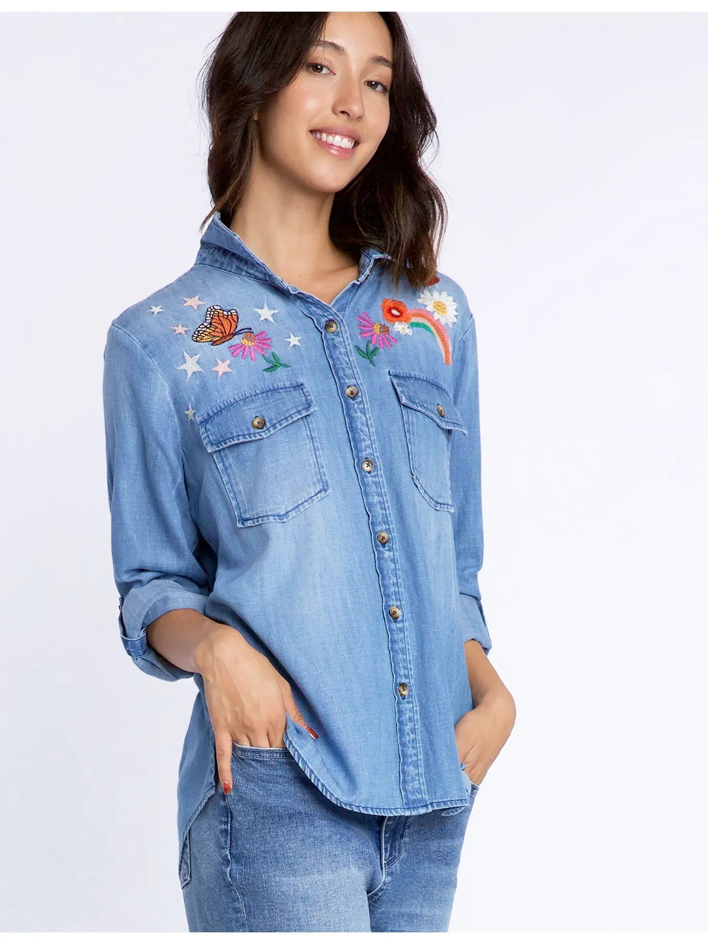 Getaway, in the Happy Place denim shirt. Super soft denim, button-front and sleeves, with idyllic mountain scene embroidery detail. Ahhhhh.