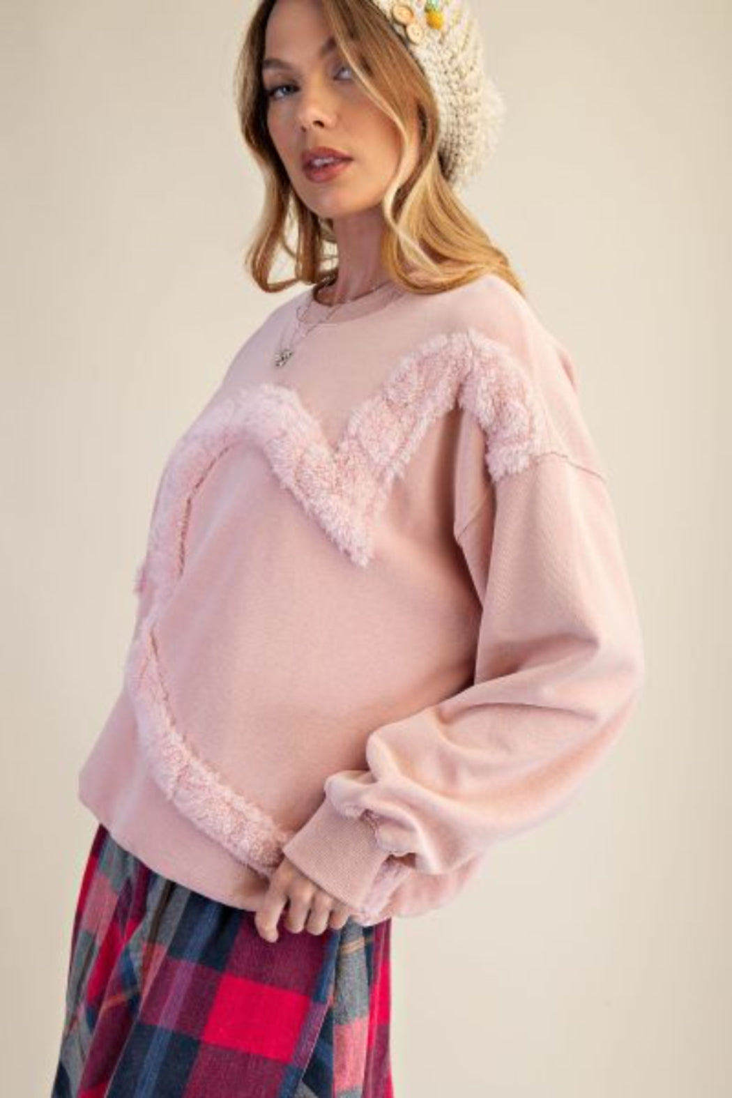 HEART FUR DETAILING WASHED TERRY PULLOVER -RELAXED, OVERSIZED FIT -DROPPED SHOULDERS -RIBBED CREW NECK -FUZZY TEXTURED HEART DESIGN ON FRONT