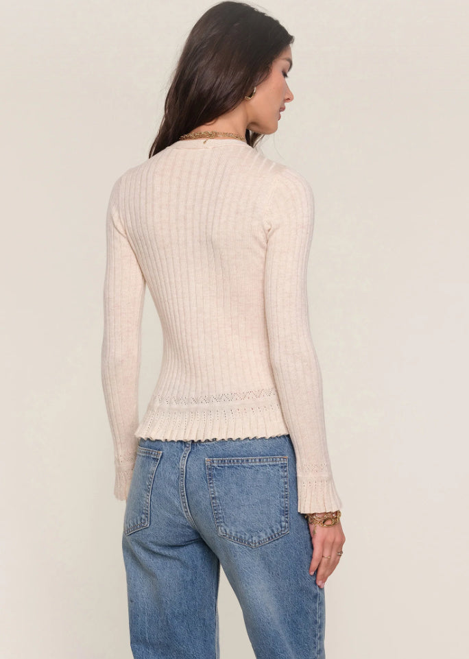 The Cecile Top is a soft, ribbed top with a slim fit. It features a delicate, pointelle stitch at the hem and cuffs with a slight flare. A simple top with a pretty detail.